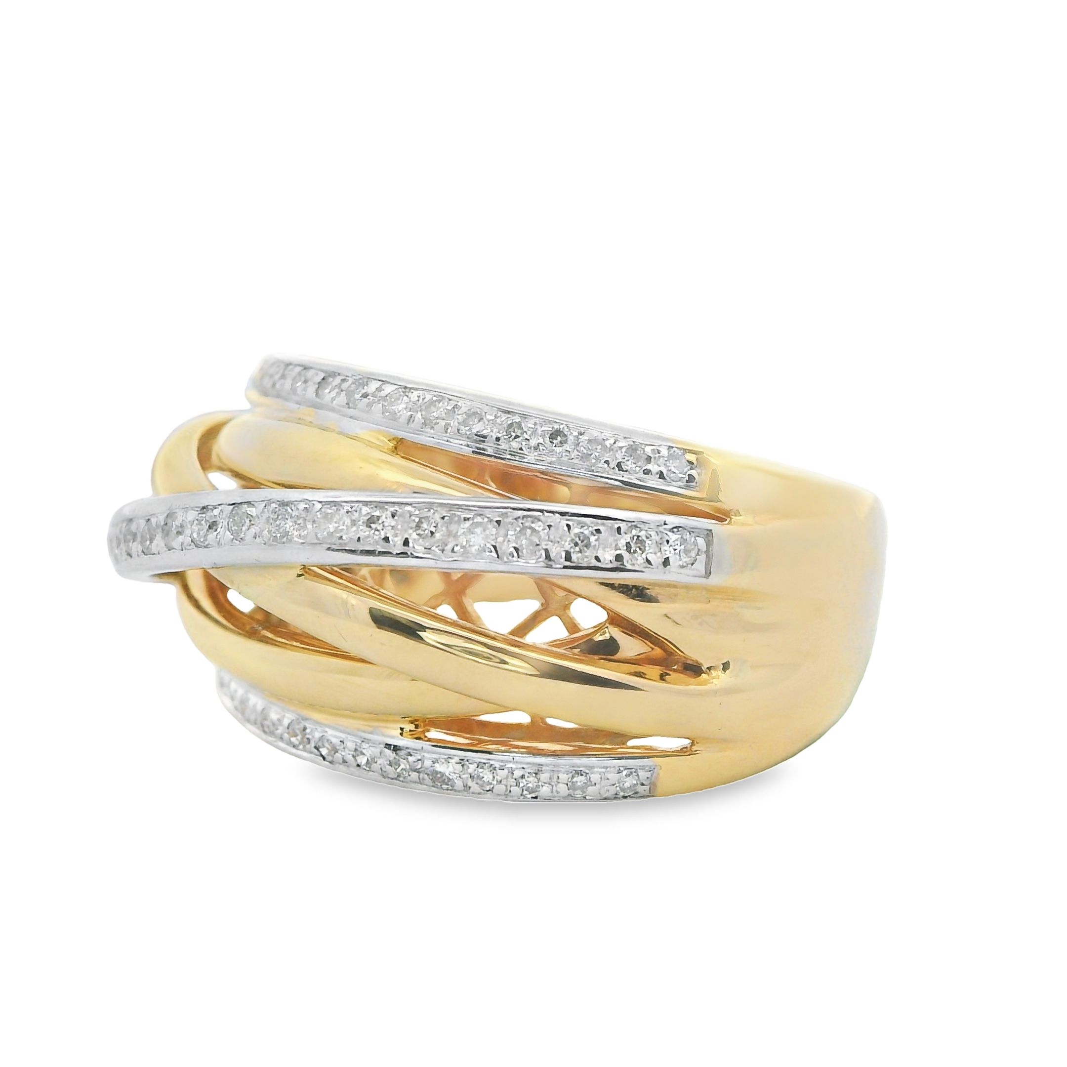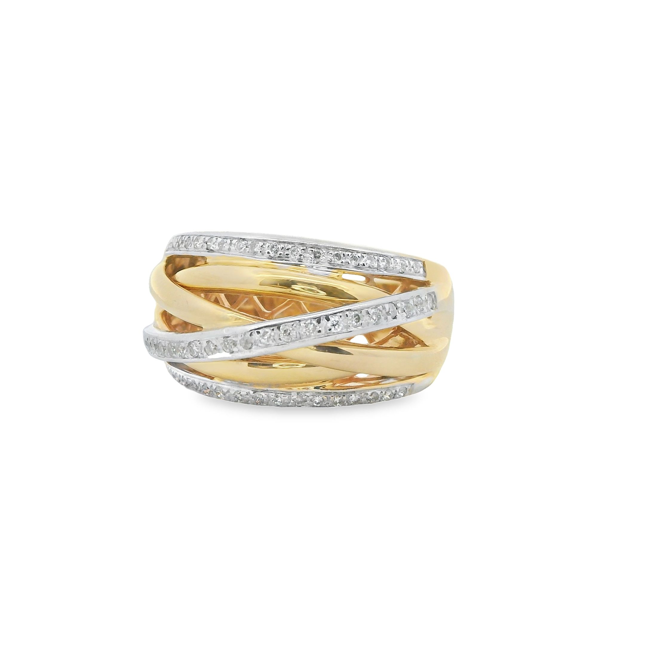 Deze exclusieve ring van Louis Bros is vervaardigd uit 14 karaat bicolor (10 gr.) en is gezet met 60 briljant geslepen diamanten met een totaalgewicht van 0.60 ct. De ring heeft een maximale breedte van 12.5 mm en dikte van 7 mm. Met deze ring om je vinger ben jij het stralende middelpunt bij elke gelegenheid. Deze ring bestaat uit onze lijn van exclusieve modellen sieraden met prachtige designs en van hoge kwaliteit .