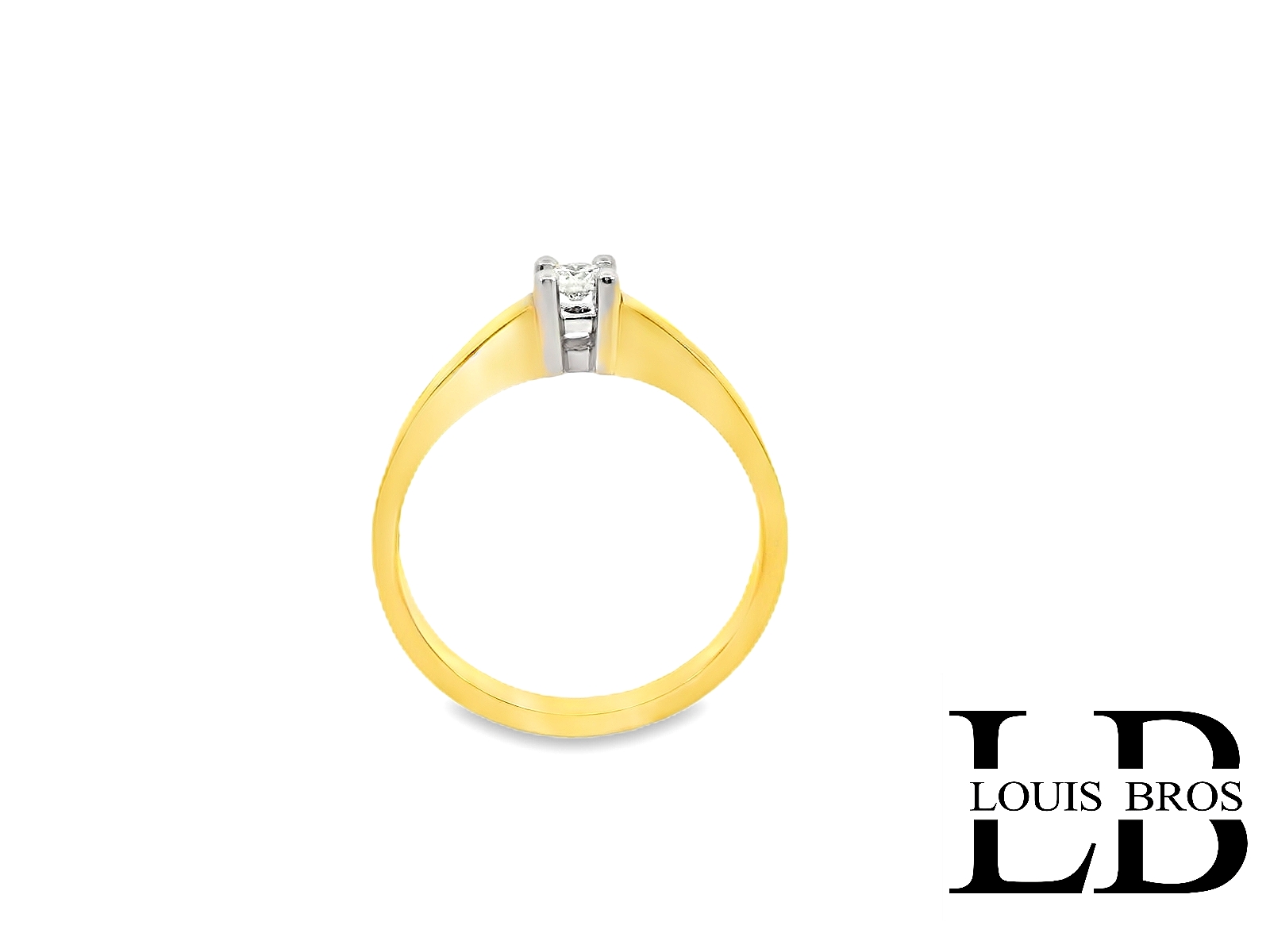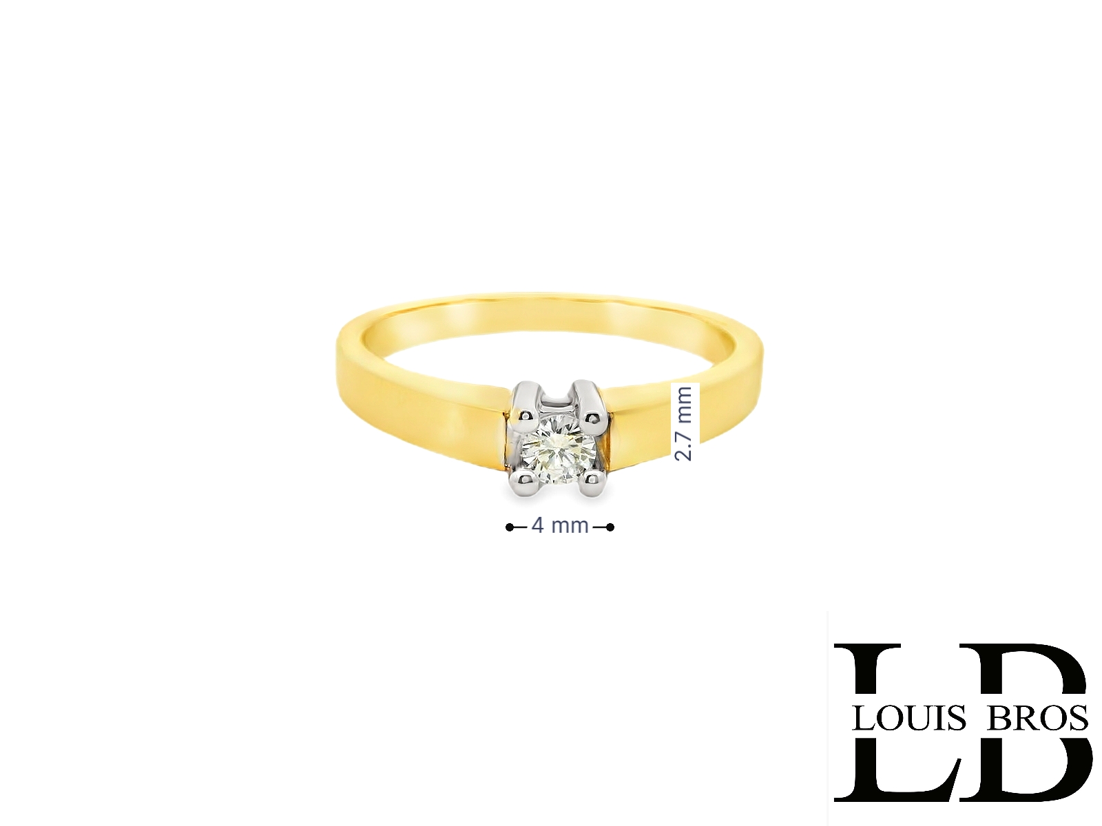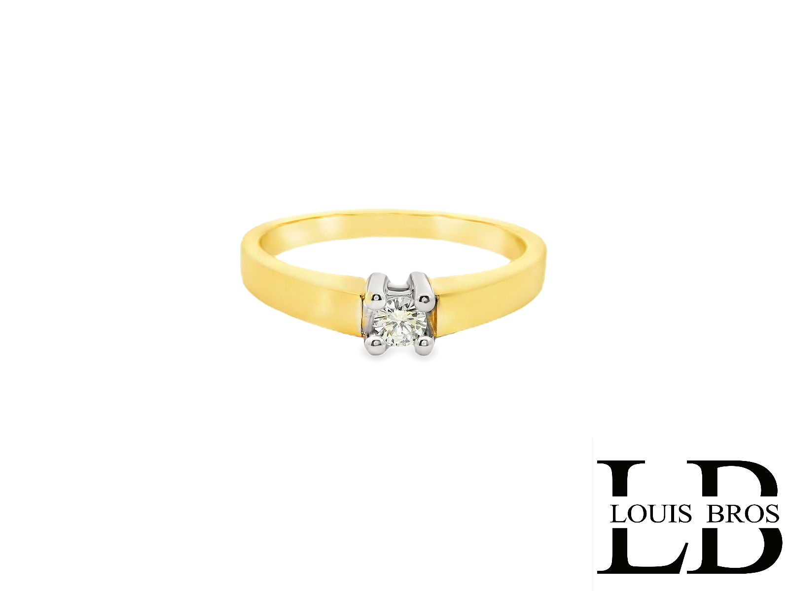 Deze elegante 14 karaat (3.51 gr) bicolor gouden ring combineert de warme gloed van geelgoud met de verfijnde uitstraling van witgoud. In het middelpunt schittert een 0.10 ct diamant van kwaliteit H/Si, wat staat voor een prachtige witte kleur en een lichte, nauwelijks zichtbare insluiting.