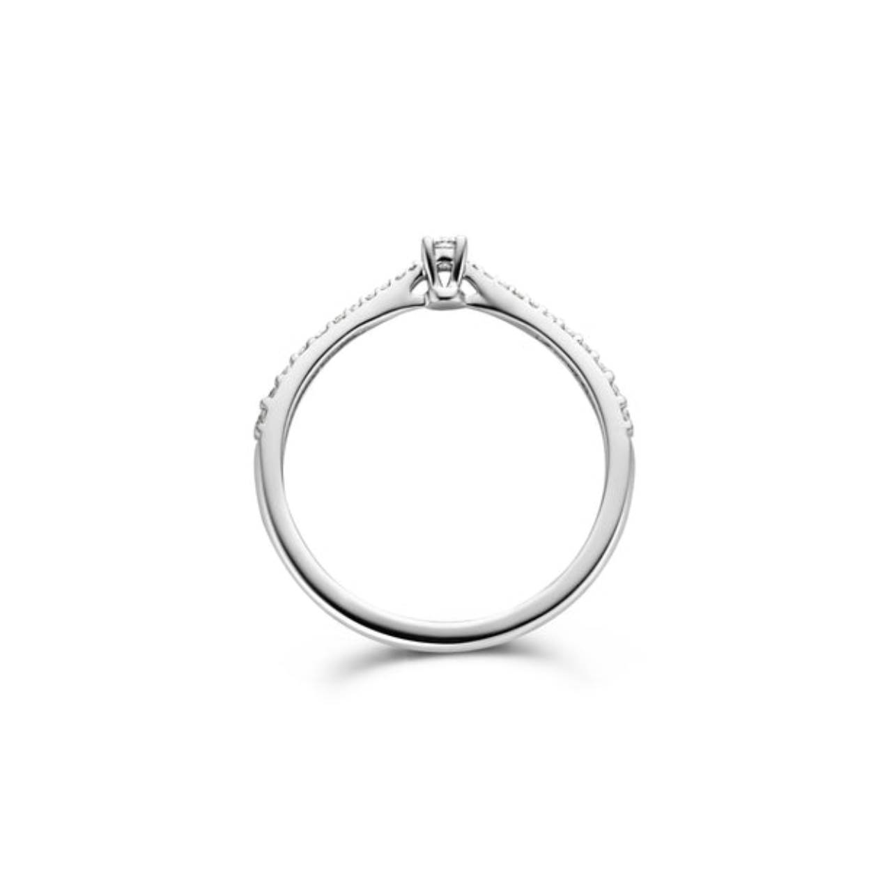 Briljant geslepen diamanten schitteren in deze ring van 14k witgoud. De diamanten hebben een karaatgewicht van 0,14, de kleinere diamanten zijn gezet in de band van de ring die een doorsnee heeft van 1,5 mm. Prachtig op zichzelf of in combinatie met andere ringen uit onze collectie.