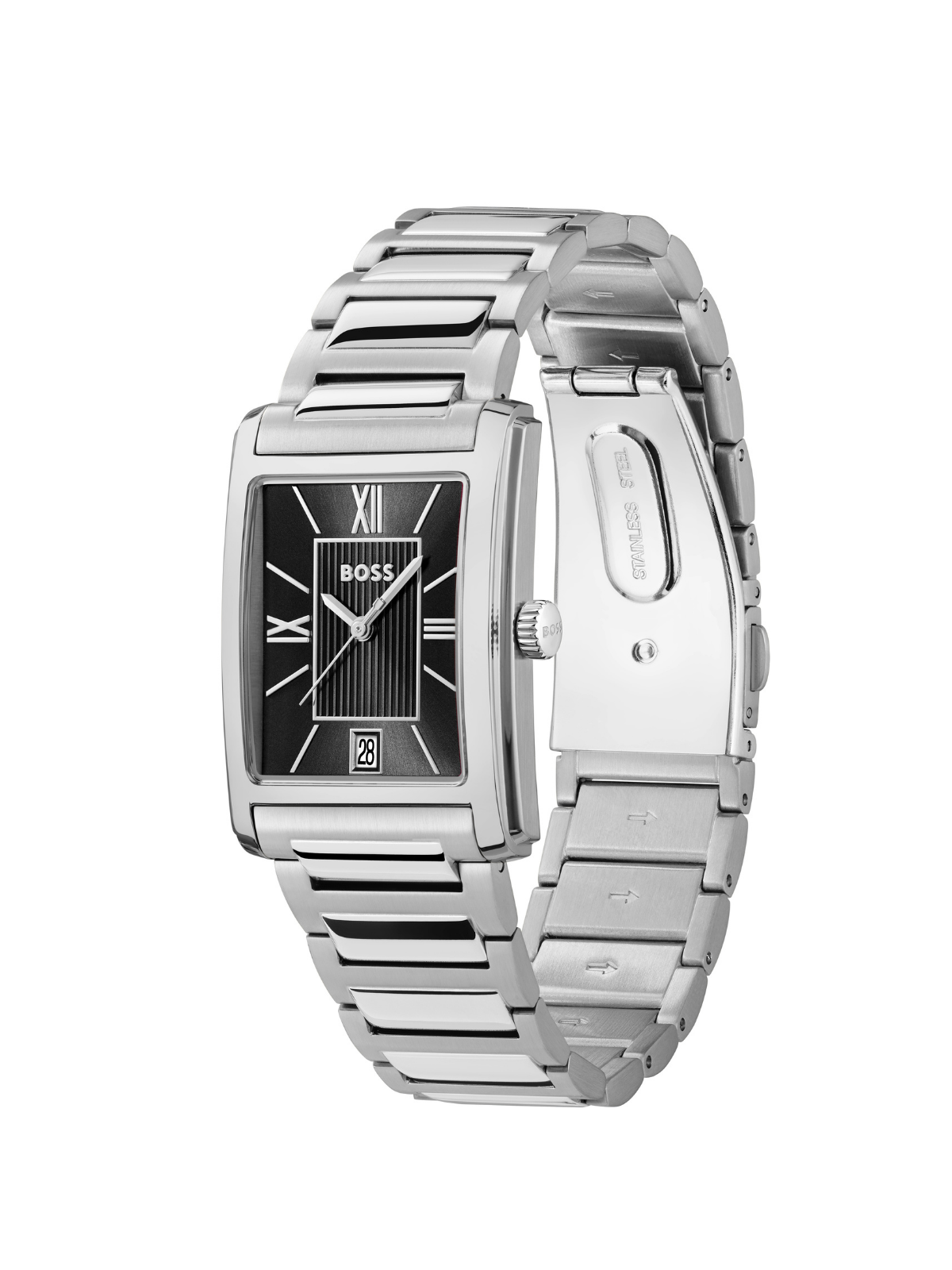 This BOSS Principle watch is available to buy online & at our Eastbourne jewellers. Showcasing a 28 x 39mm steel case which houses a quartz movement, the watch is presented on a steel bracelet and finished with a black dial.