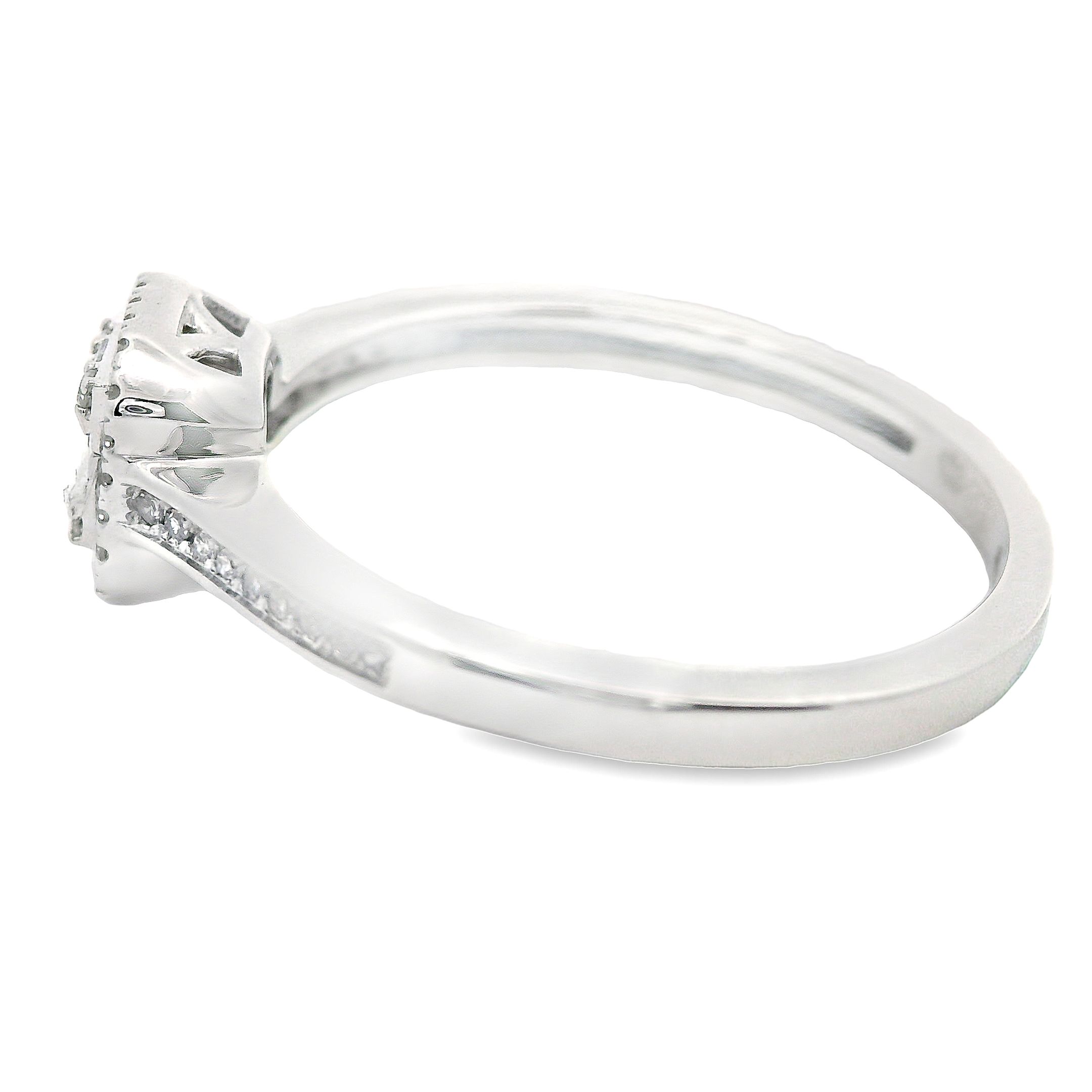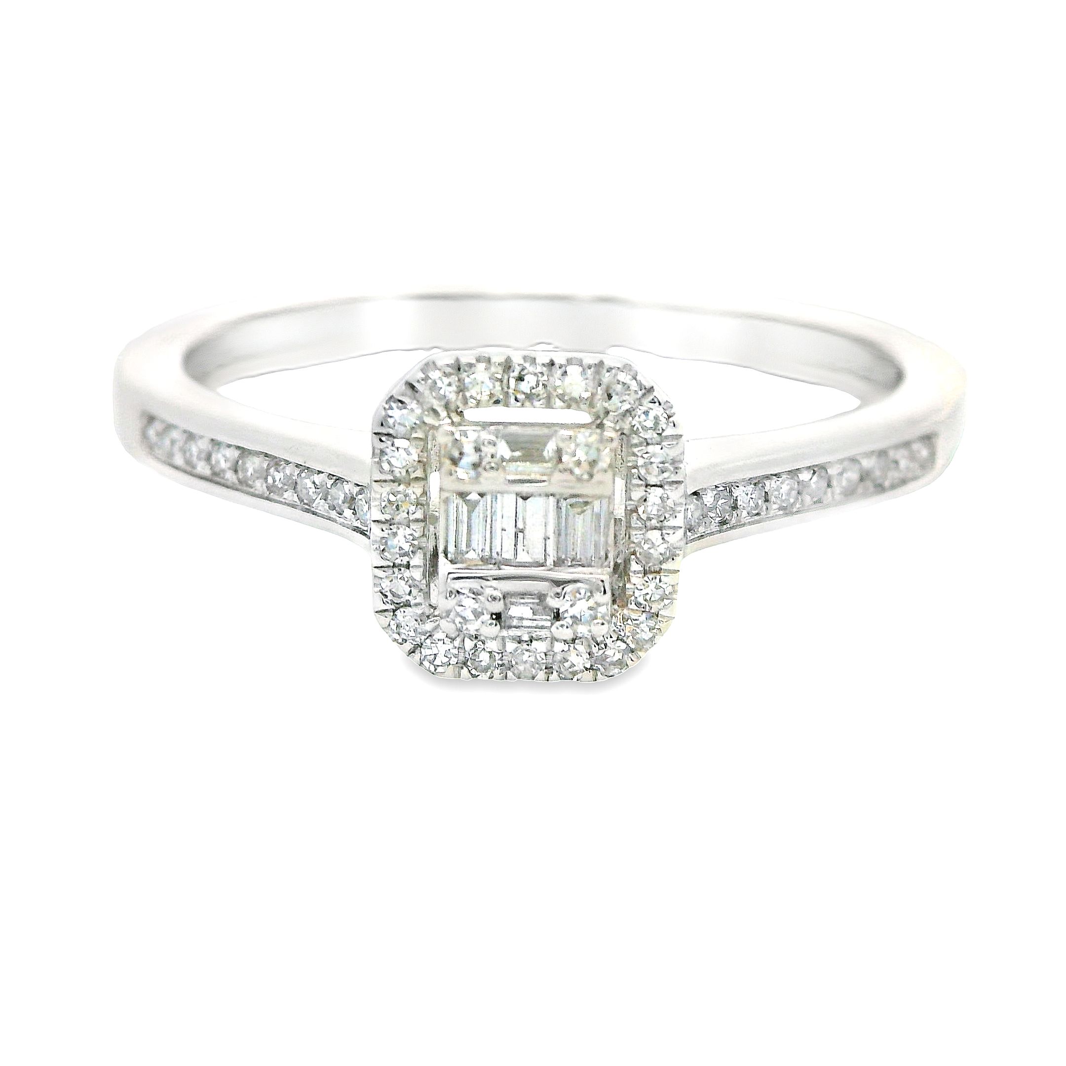 Deze ring van Louis Bros zijn vervaardigd uit 14 karaat witgoud (2.04 gr.) en is gezet met 5 baguette 0.04ct en 40 briljant geslepen diamanten met een totaalgewicht van 0.09 ct. De ring heeft een diameter van 6.5 mm, minimale breedte van 2 mm. en een hoogte van 3.5 mm.