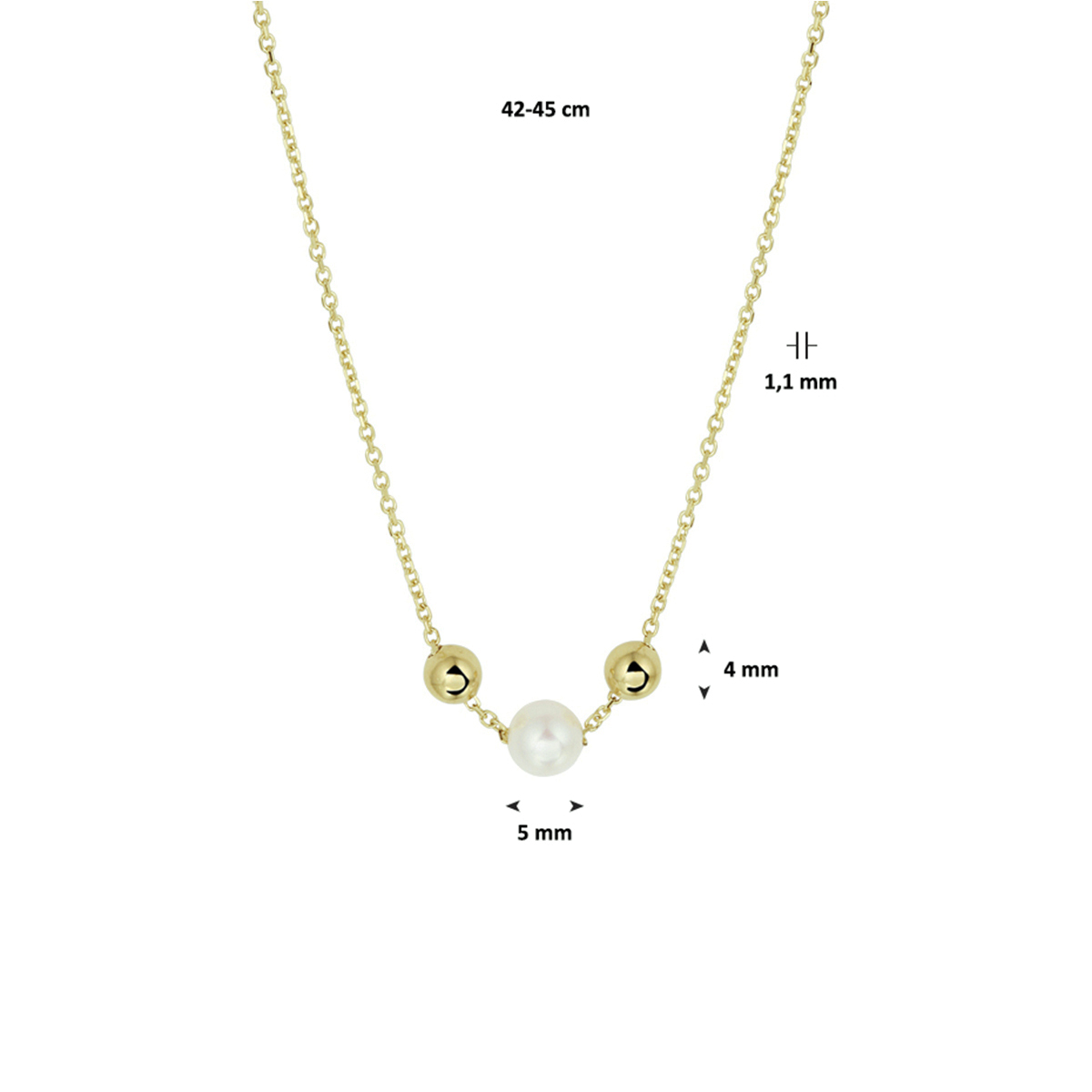 Beschrijving: Stijlvol geelgouden anker collier uitgevoerd met poli afgewerkte bolletjes, een zoetwaterparel en een stevige karabijn sluiting. Het collier heeft draaglengtes van 42 en 45cm en is goed te combineren met bijpassende parel sieraden uit onze collectie of vanuit je eigen stash.