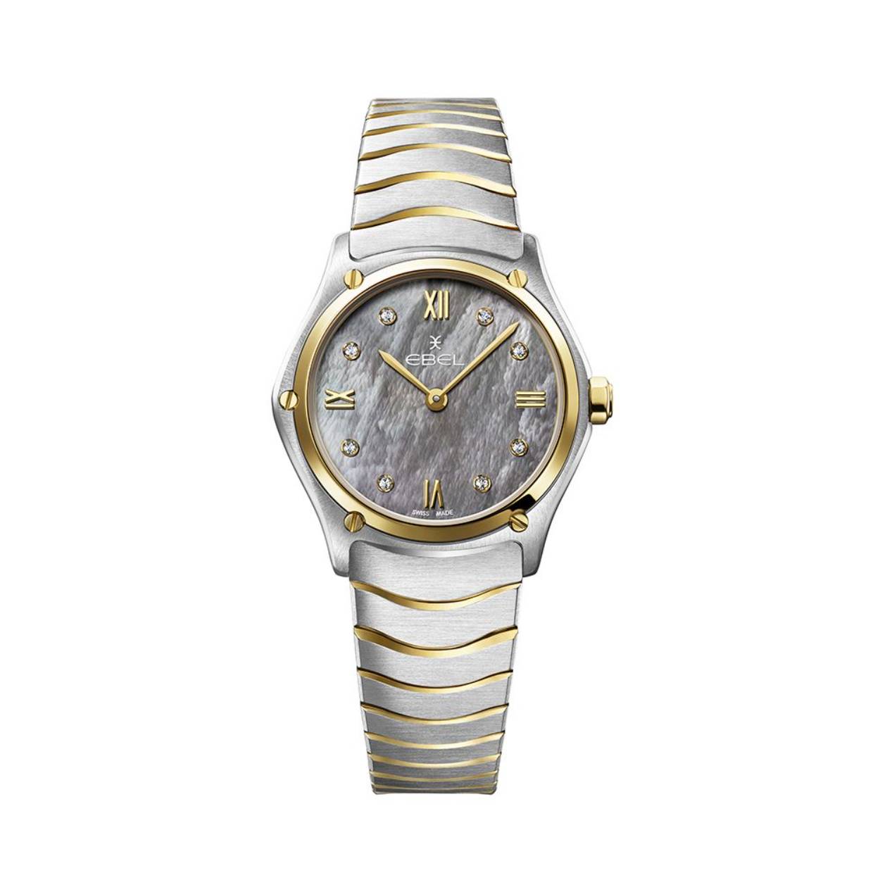 Bestel dit EBEL Sport Classic dames horloge op onze webshop. Het model met het referentienummer 1216642 is uitgerust met een Zwitsers top kwaliteit Quartz uurwerk. Het uurwerk is geplaatst in een hoogwaardige edelstalen horlogekast met een 18 kt. geelgouden bezel, schroefdetails en kroon. Op de grijze parelmoer wijzerplaat is met geelgouden PVD wijzers en Romeinse cijfers tezamen met 8 diamanten de tijd op analoge wijze af te lezen. De diamanten zijn Top Wesselton VS kwaliteit en hebben een totaalgewicht van 0.052 ct. De edelstalen geschakelde horlogeband met geelgouden PVD delen is aan de ronde horlogekast van 29 mm. gemonteerd. De band is voorzien van een vouwsluiting, met het EBEL logo. Deze sluiting zorgt ervoor dat uw horloge niet zomaar van uw pols kan glijden.