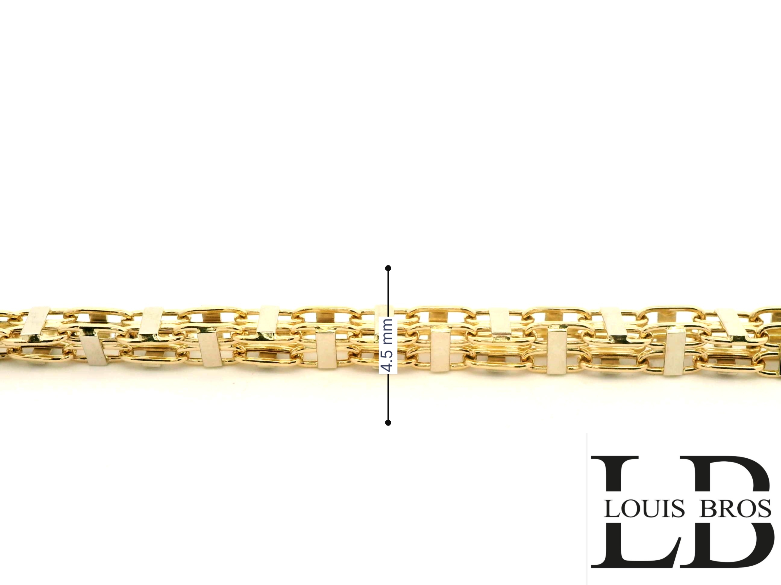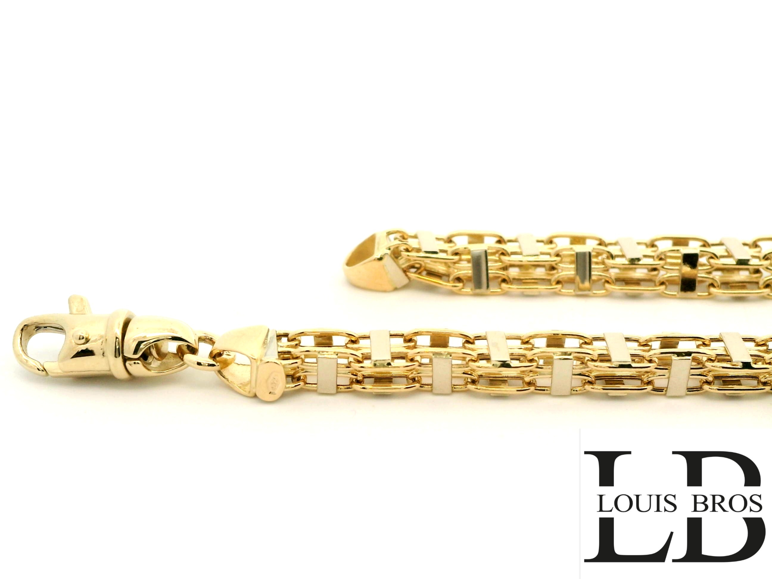 Maak een krachtig stijlstatement met dit luxueuze bicolor heren collier van 14 karaat goud (18.82 gr), ontworpen door het sieradenhuis Louis Bros. Dit collier is een toonbeeld van vakmanschap en elegantie, met een robuuste doch verfijnde structuur die direct in het oog springt.