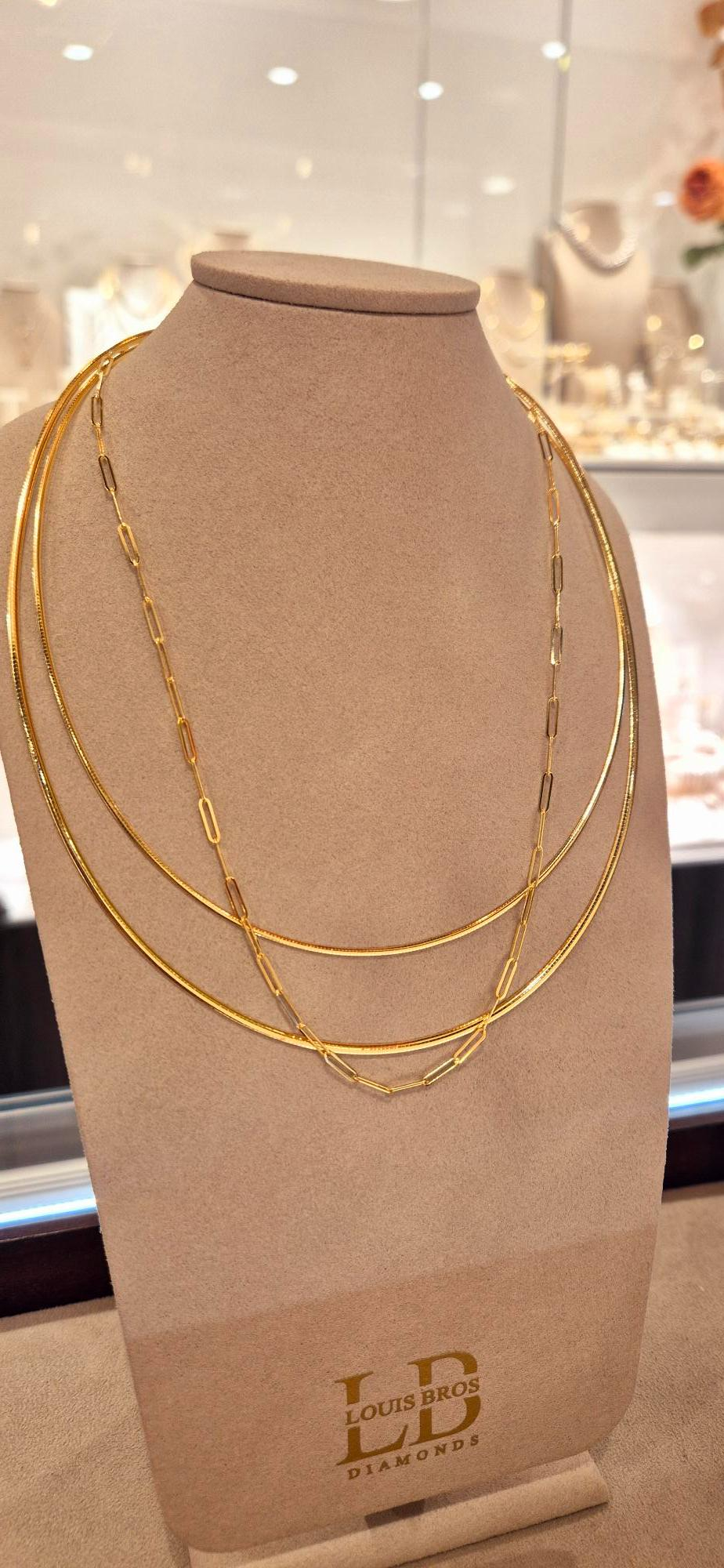 Dit verfijnde omega collier (14.20 gr) is een absolute blikvanger en straalt pure elegantie uit. Vervaardigd uit 14 karaat geel goud, combineert het collier klassieke luxe met een eigentijdse uitstraling. Het bijzondere ontwerp bestaat uit verschillende schakels en lijnen die harmonieus samenkomen en een speels maar toch stijlvol geheel vormen.