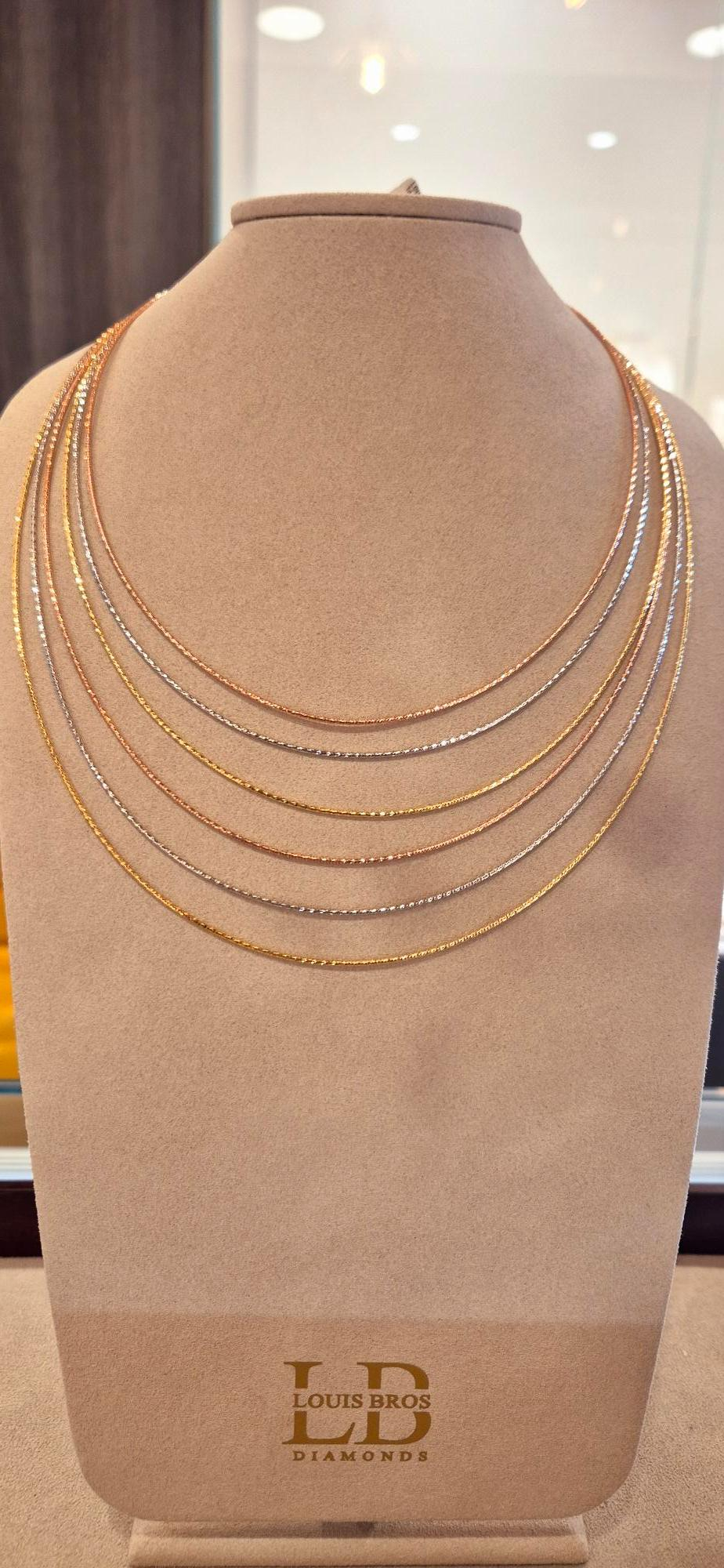 Het bijzondere ontwerp bestaat uit meerdere verfijnde lijnen die sierlijk over elkaar vallen, waardoor het collier een gelaagd en speels effect creëert. De combinatie van de drie goudtinten maakt dit sieraad veelzijdig en perfect te combineren met andere juwelen in zowel wit-, geel- als roségoud.