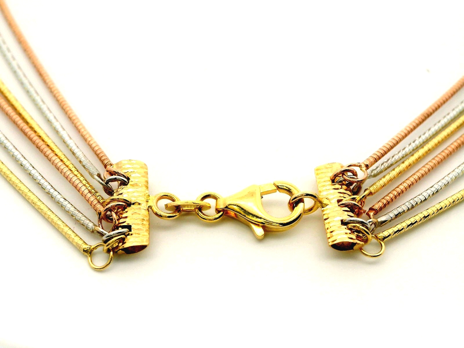 Dit schitterende omega collier (26.76 gr) is een echte eyecatcher en straalt tijdloze elegantie uit. Vervaardigd uit 14 karaat tricolor goud – geel, wit en roségoud – vormt het een harmonieus samenspel van kleuren dat elke outfit een luxueuze uitstraling geeft.