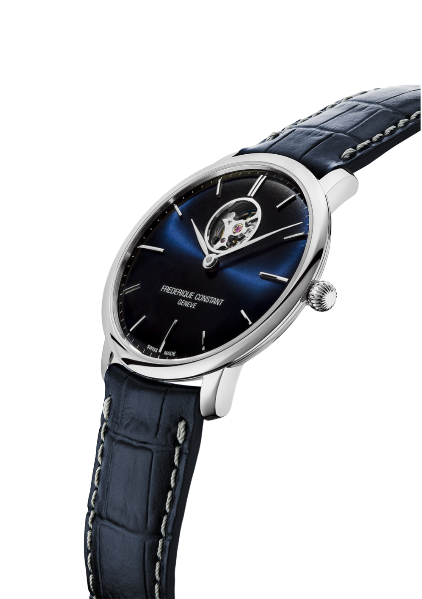 Dit Frederique Constant Heartbeat Slimline herenhorloge is bekend onder Frederique Constant-referentienummer FC-312N4S6. Het horloge heeft een mechanisch uurwerk met automatische opwindfunctie dat geplaatst is in een edelstalen kast. Op de blauwe wijzerplaat is analoge tijdsweergave zichtbaar. Aan de kast zit een blauwe lederen horlogeband met een vouwsluiting.