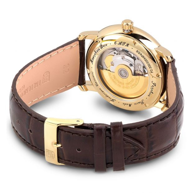 Dit Frederique Constant Classics herenhorloge is bekend onder Frederique Constant-referentienummer FC-335MC4P5. Het horloge heeft een mechanisch uurwerk met automatische opwindfunctie dat geplaatst is in een edelstalen Verguld (15 micron) kast. Op de grijze wijzerplaat is analoge tijdsweergave zichtbaar. Aan de kast zit een bruine lederen horlogeband met een doorn- / gespsluiting.