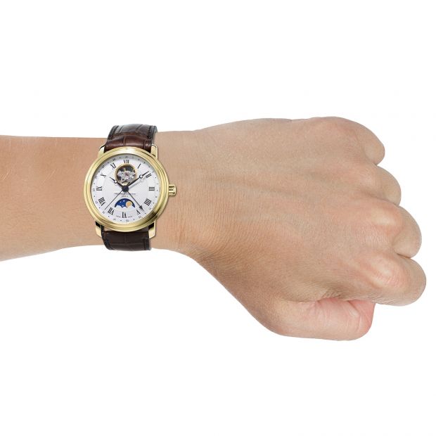 Het mechanisch uurwerk met automatische opwindfunctie biedt u datum-aanduiding, en weergave van de maanfase als tijdfunctie(s). De ronde horlogekast is 30m waterdicht en voorzien van een saffierglas.
