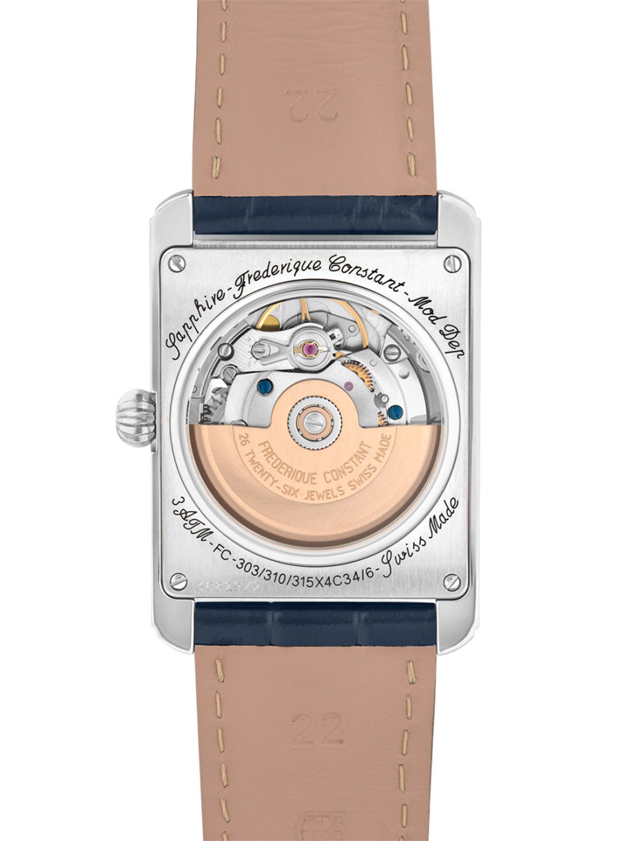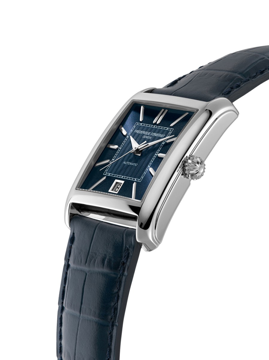 Dit dames/heren horloge van Frederique Constant is onderdeel van de Classics Carree collectie. De serie wordt gekenmerkt door modellen met een zeer elegant rechthoekig formaat en een klassieke uitstraling. Model FC-303N4C6 heeft een edelstalen kast (30 x 33mm) en een blauw leren horlogeband. De blauwe wijzerplaat heeft zilverkleurige indexcijfer en wijzers. Het horloge is verfijnd afgewerkt met een krasarm saffier glas en een waterdichtheid tot 30 meter. Het automatisch uurwerk van dit model genereert een gangreserve van 38 uur.
