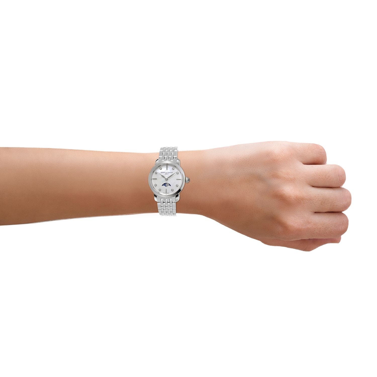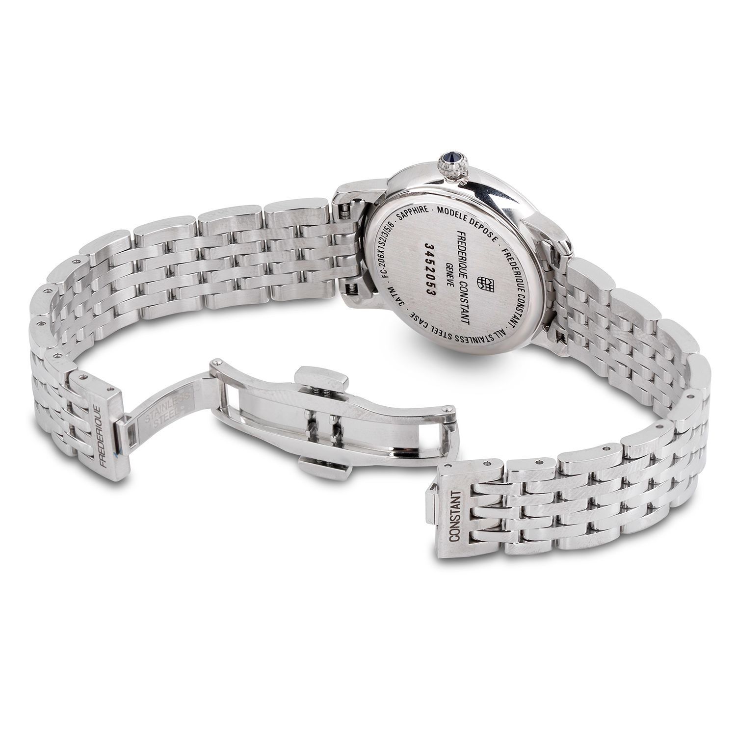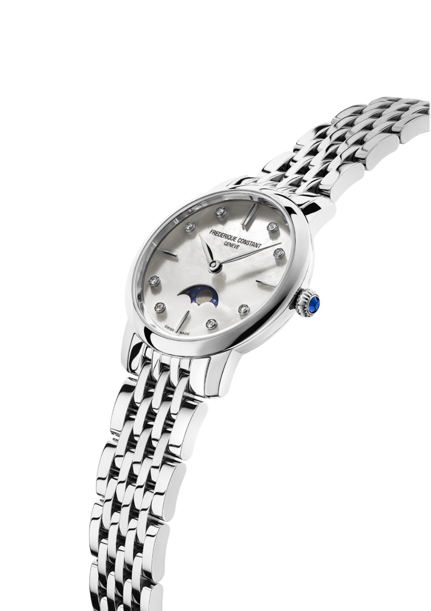 Dit Frederique Constant Slimline dameshorloge is bekend onder Frederique Constant-referentienummer FC-206MPWD1S6B. Het horloge heeft een quartz-uurwerk dat geplaatst is in een edelstalen kast. Op de witte parelmoeren wijzerplaat is analoge tijdsweergave zichtbaar. Aan de kast zit een staal- of zilverkleurige stalen horlogeband met een vouwsluiting.