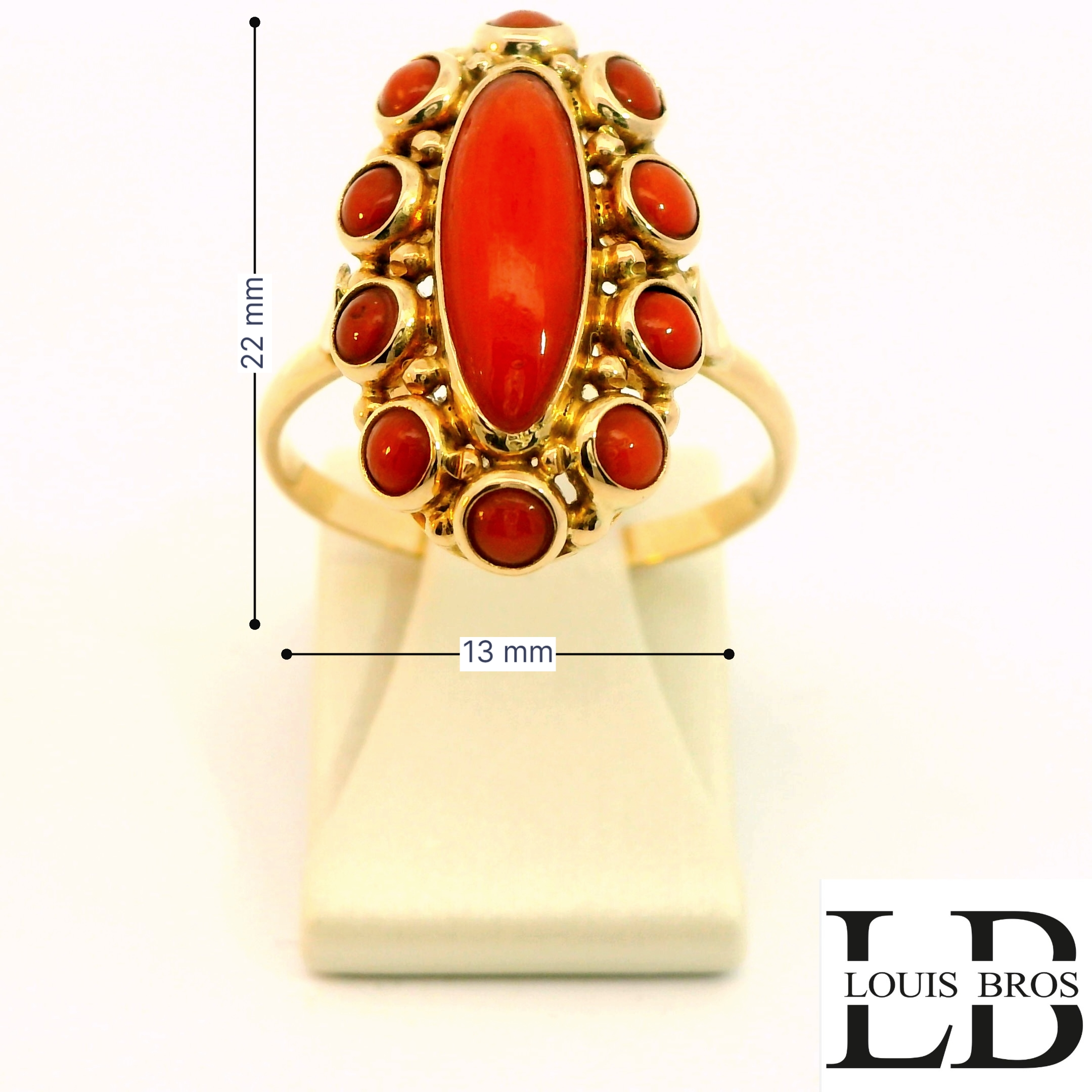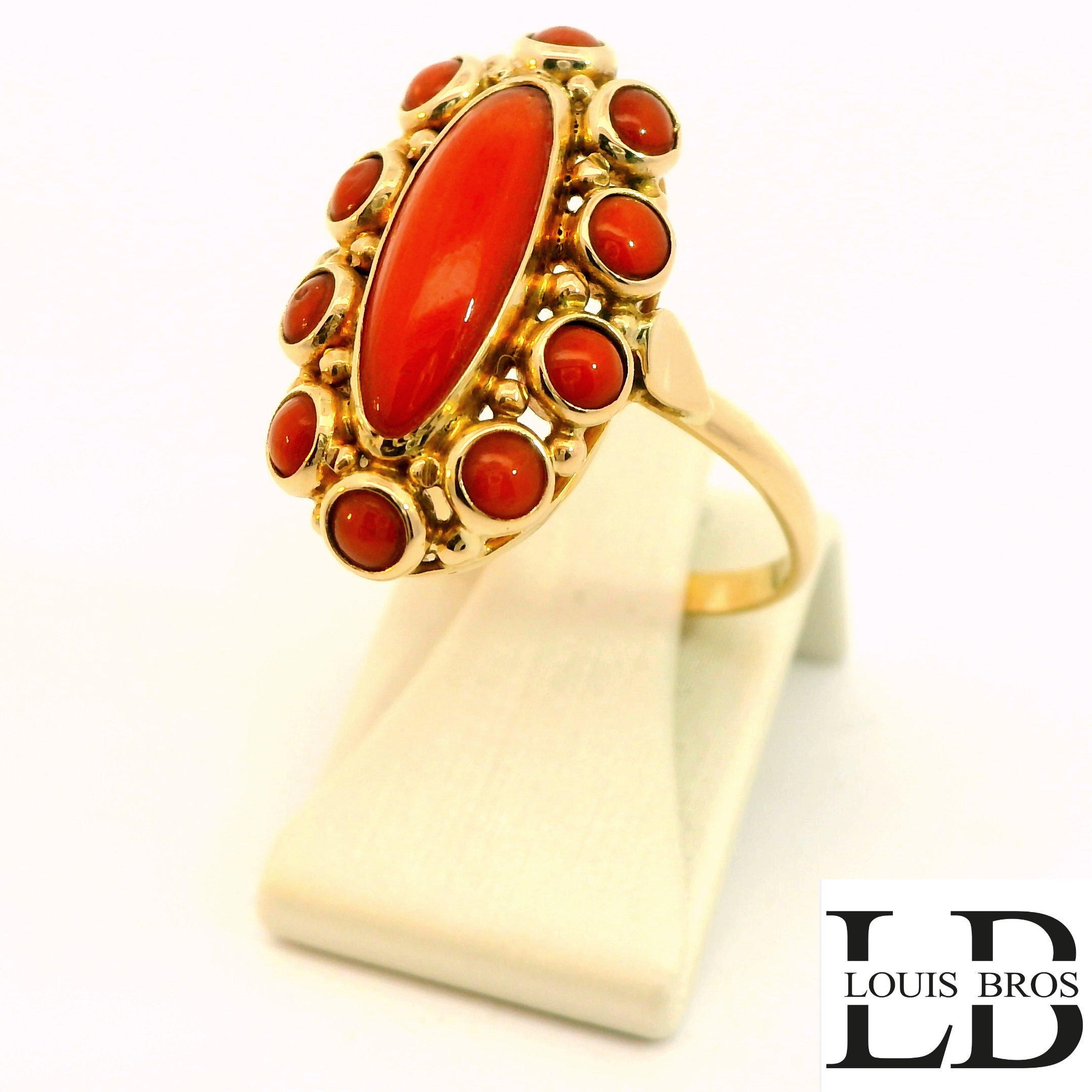 Prachtige vintage ring vervaardigd uit 14 karaat geelgoud, bezet met een authentieke bloedkoraal steen. De warme, diepe roodtint van de bloedkoraal vormt een schitterend contrast met het glanzende geelgoud. Een klassiek en stijlvol ontwerp met een tijdloze uitstraling.