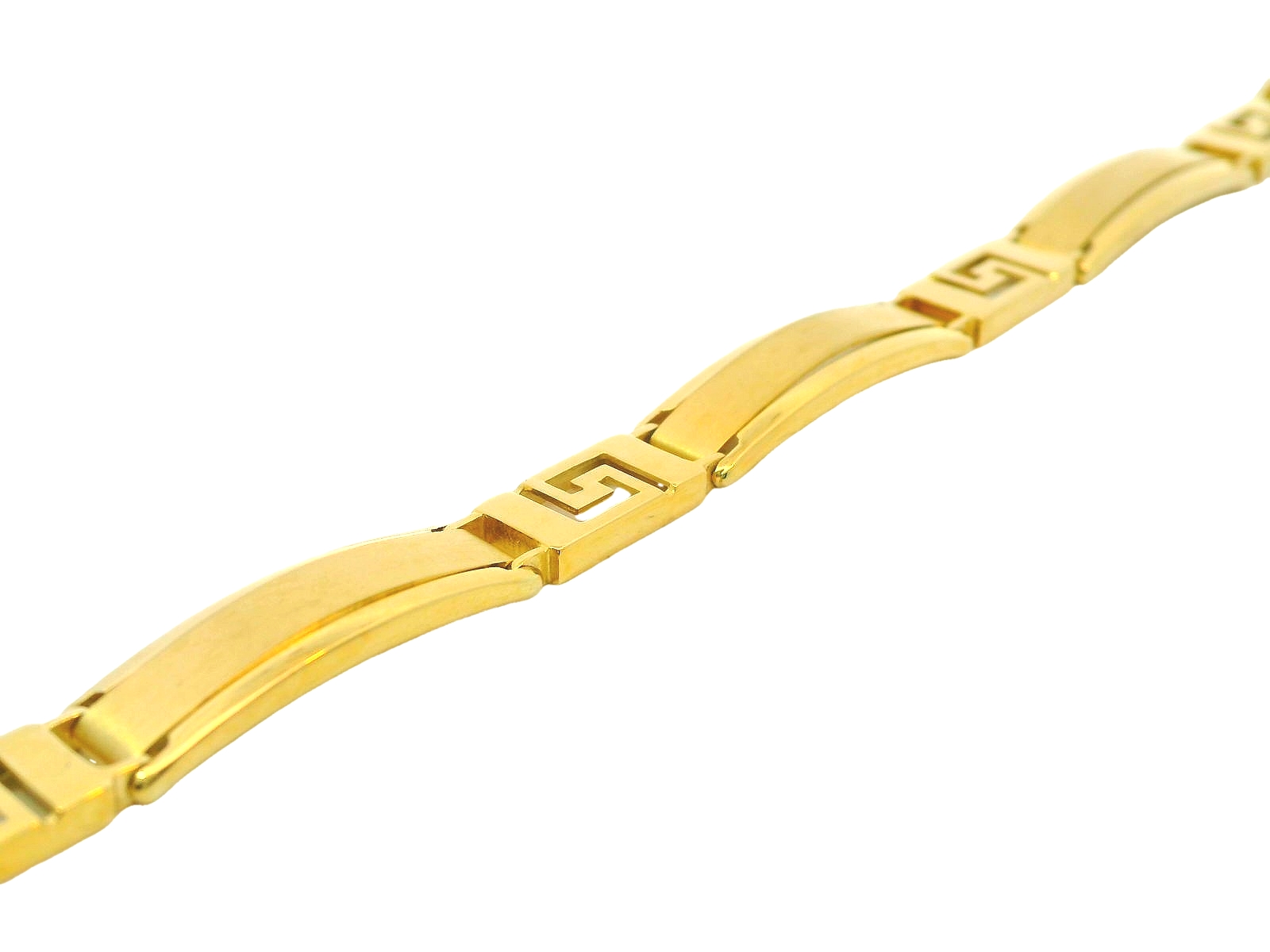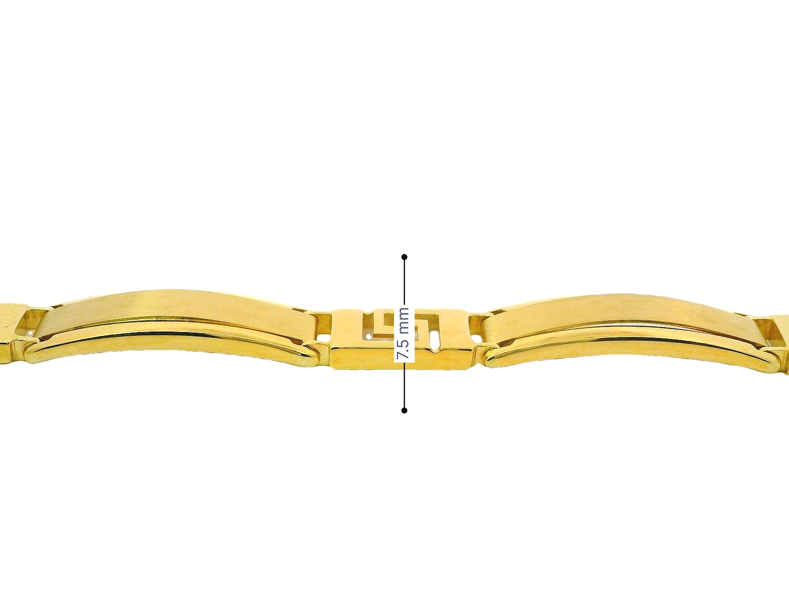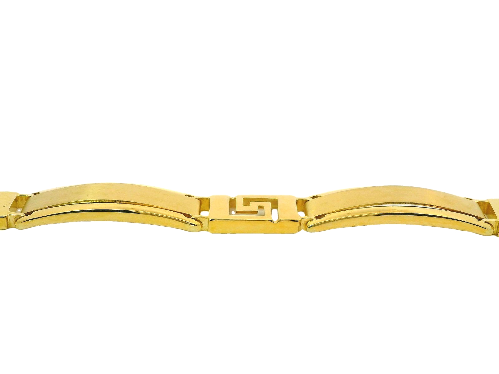 Deze armband is uitgevoerd in een klassieke schakel met een gedetailleerd Greek style-patroon. Het ontwerp straalt tijdloze elegantie uit, met de kenmerkende geometrische motieven geïnspireerd op de rijke Griekse cultuur. De robuuste schakels in combinatie met het verfijnde patroon geven de armband een unieke en krachtige uitstraling. Perfect voor de man die houdt van luxe en een vleugje geschiedenis in zijn stijl. Een sieraad dat moeiteloos klasse en persoonlijkheid toevoegt aan elke outfit.