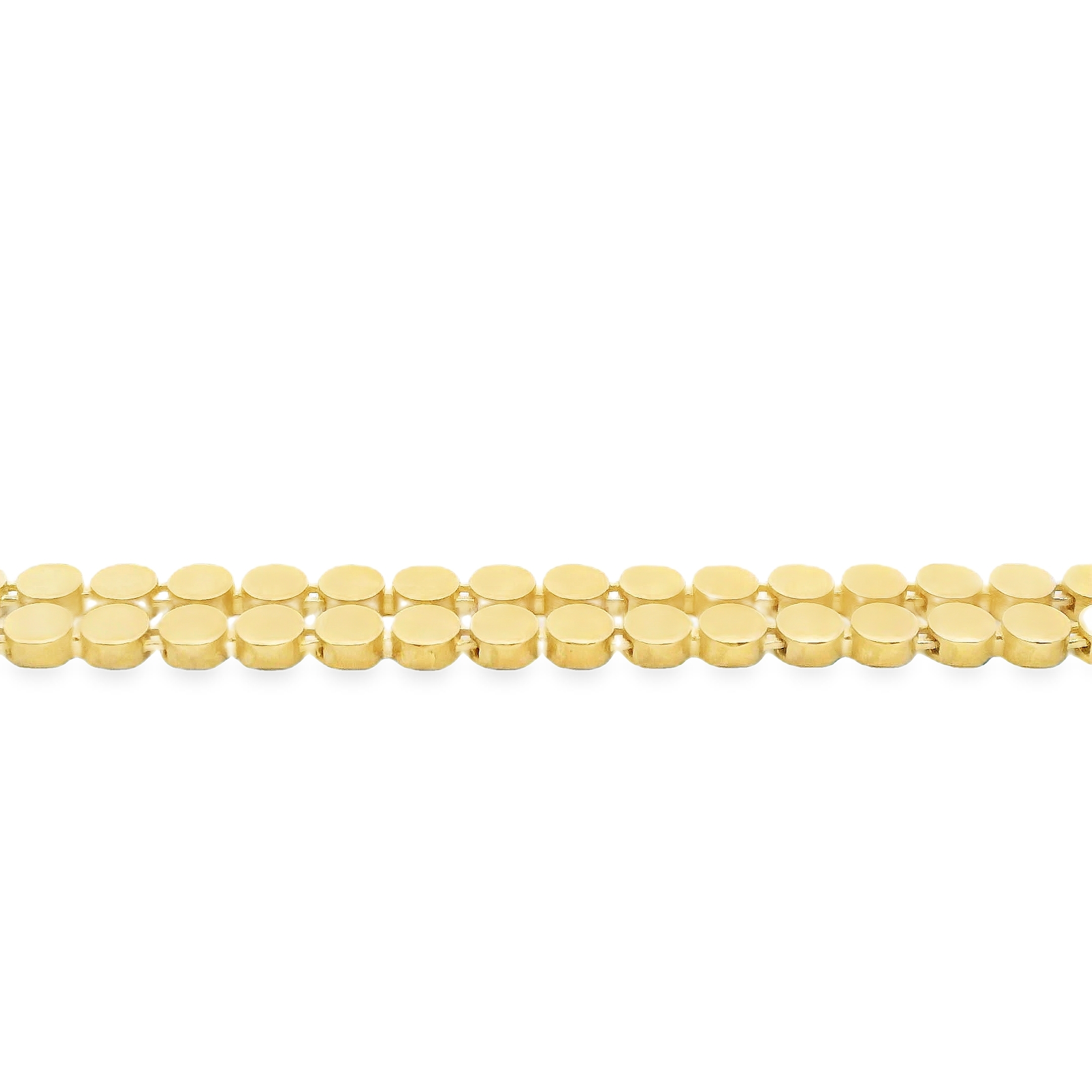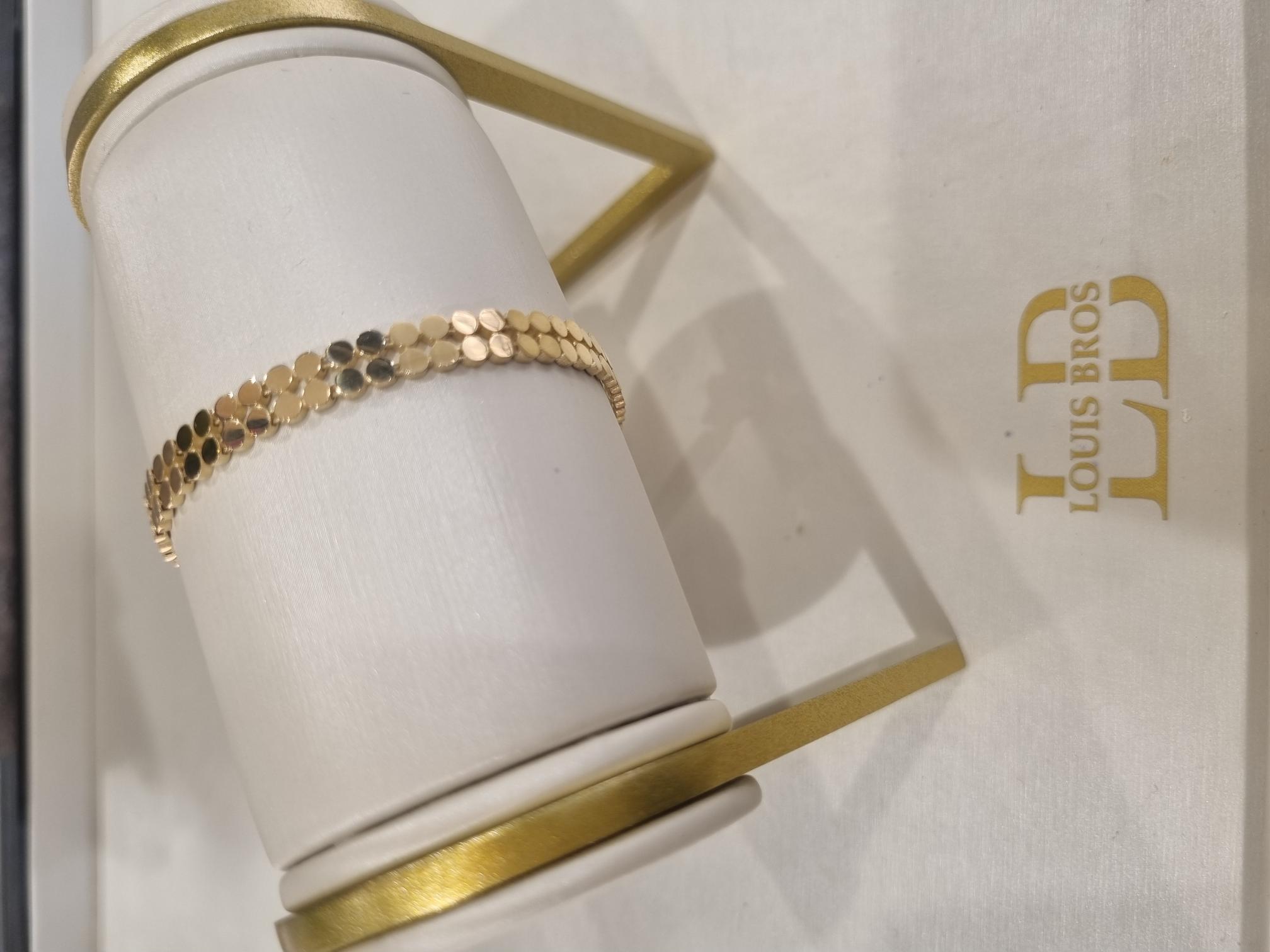 Deze armband van Louis Bros is vervaardigd uit 14 karaat geelgoud (6.93 gr.). De armband heeft een dikte van 1.3 mm en een breedte van 5 mm.