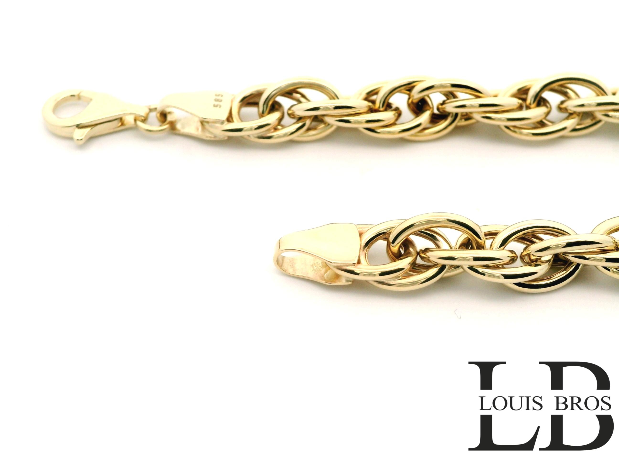 Deze elegante 14 karaat geelgouden armband (7.97 gr) straalt luxe en verfijning uit. Het unieke schakeldesign combineert een robuuste uitstraling met een subtiele glans, waardoor het sieraad perfect is voor zowel dagelijks gebruik als speciale gelegenheden.