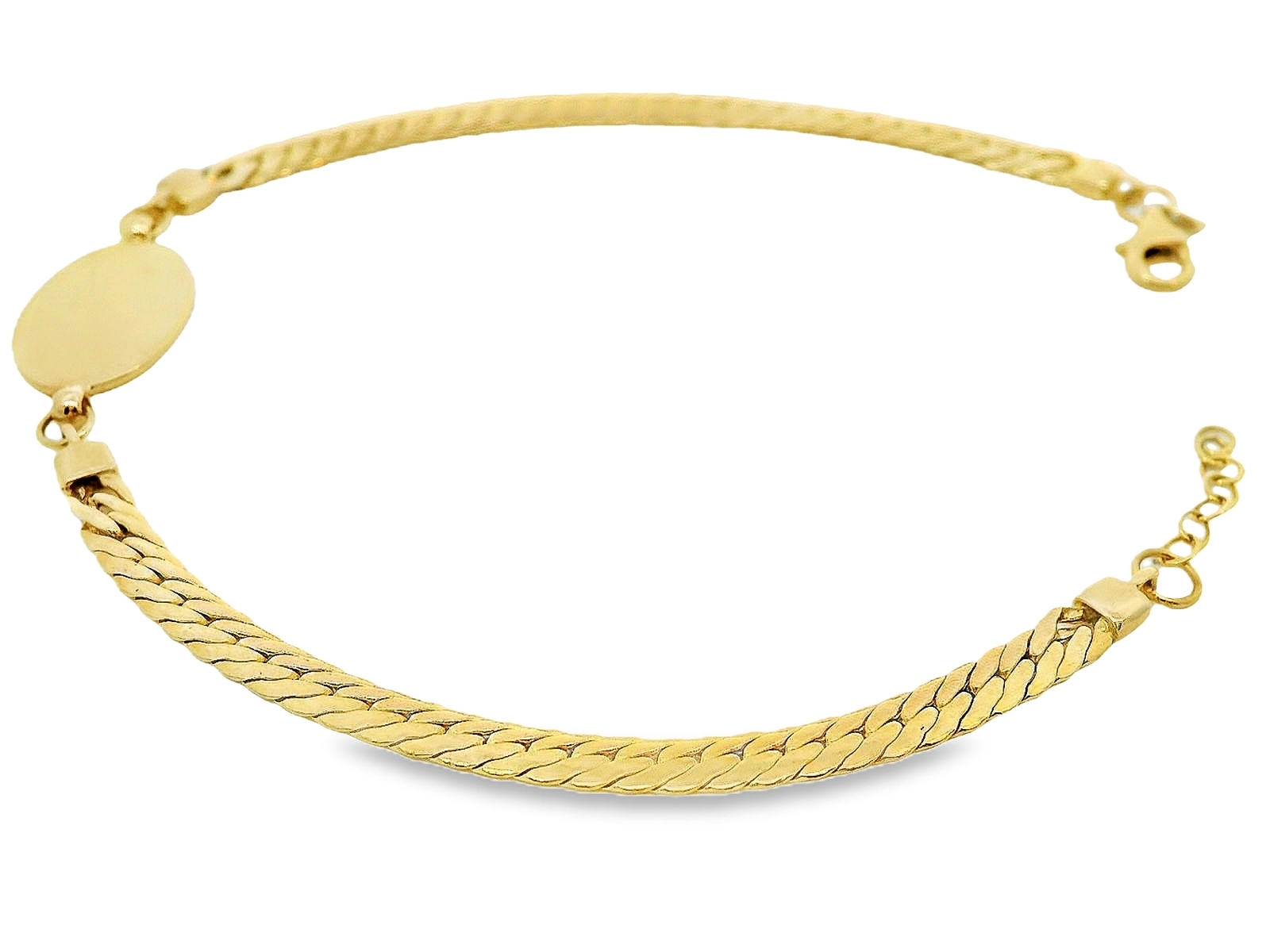 Deze stijlvolle armband is voorzien van een elegant ovaal graveerplaatje, perfect voor een persoonlijke boodschap of initialen. Het tijdloze ontwerp combineert verfijning met een subtiele personalisatie, waardoor de armband een uniek en betekenisvol sieraad wordt. Het warme geelgoud voegt een luxueuze uitstraling toe, ideaal om dagelijks te dragen of als speciaal geschenk voor een geliefde.