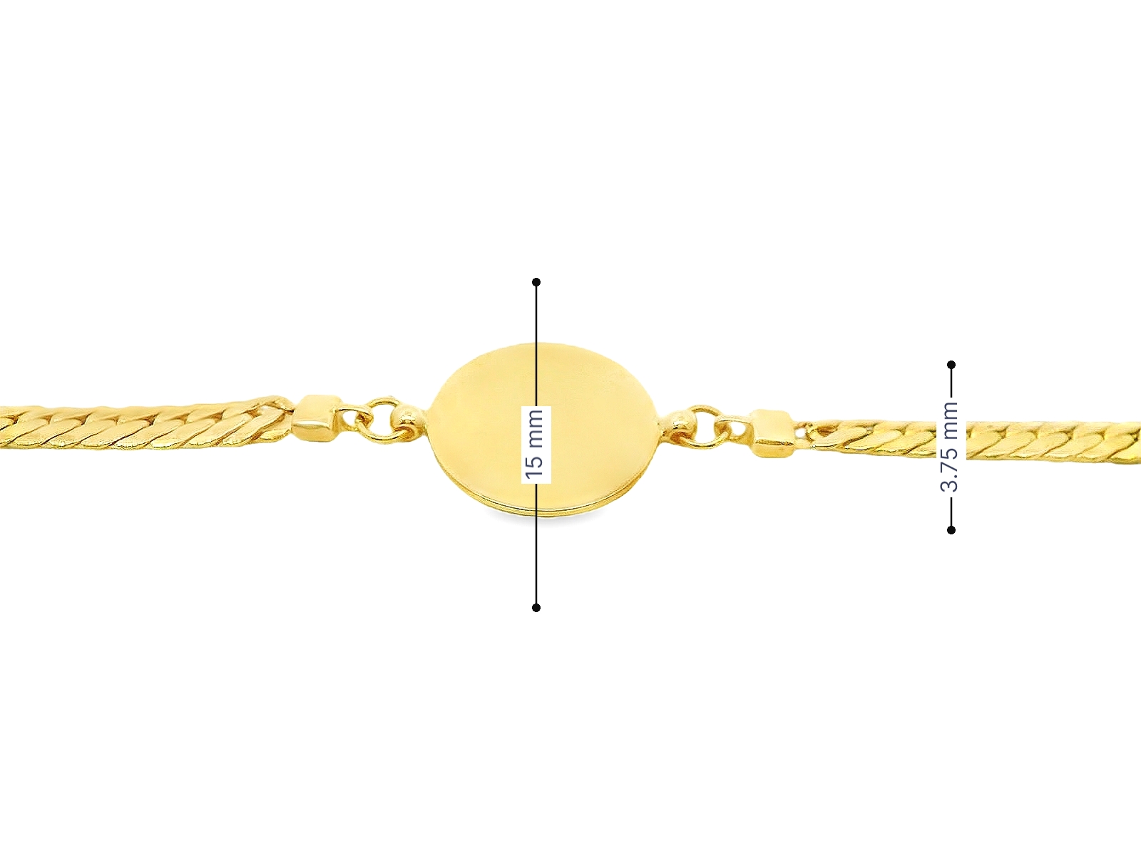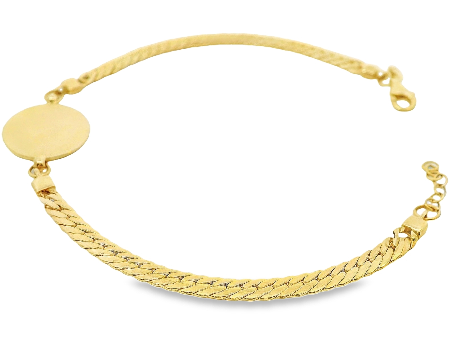 Deze verfijnde armband heeft een elegant rond graveerplaatje, ideaal voor het personaliseren met een naam, initialen of speciale datum. Het eenvoudige maar stijlvolle ontwerp maakt het sieraad bijzonder en betekenisvol. Het warme geelgoud geeft de armband een luxe uitstraling, perfect om dagelijks te dragen of als een persoonlijk cadeau voor een dierbare.