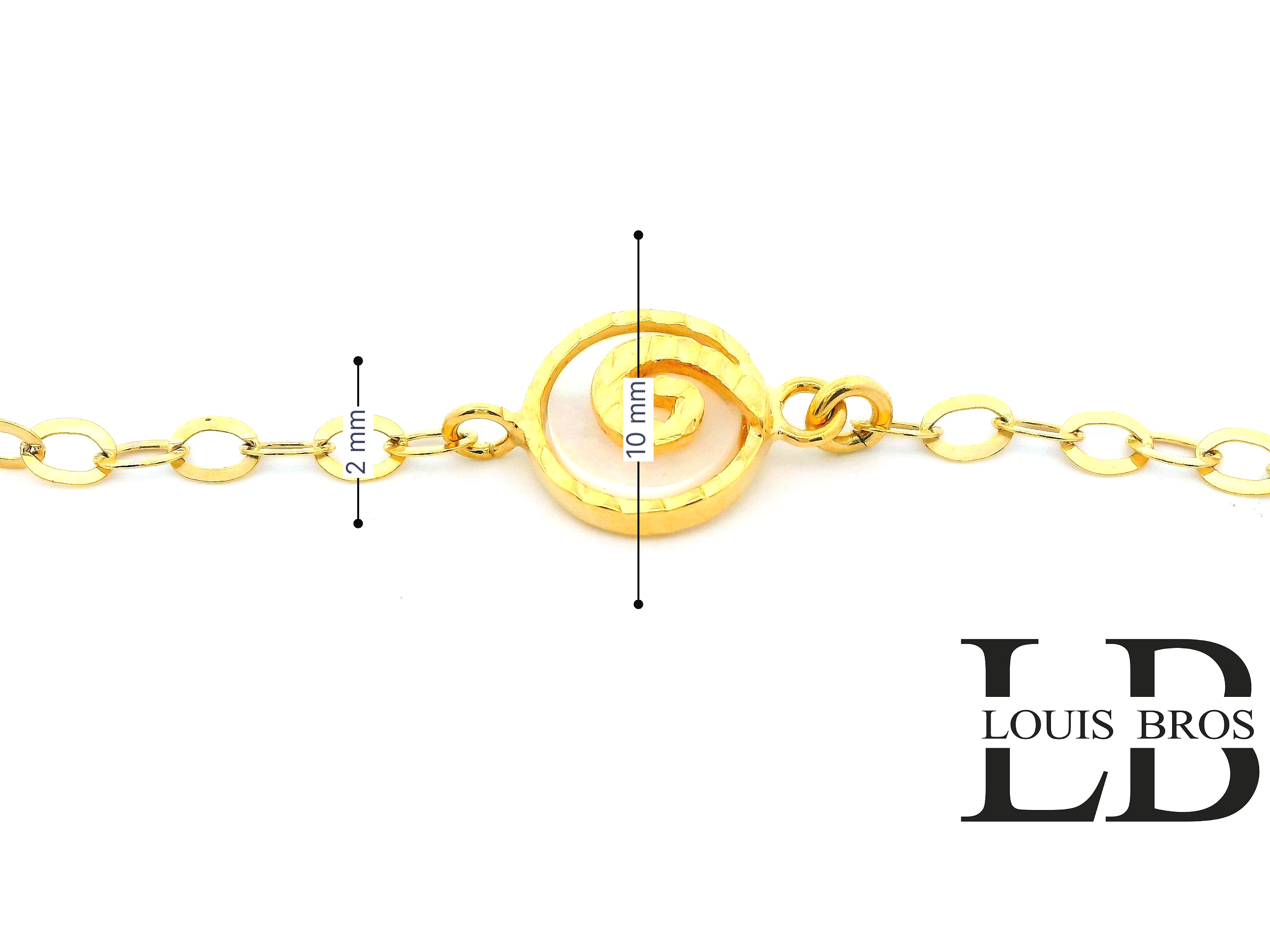 Laat je sieradencollectie opvallen met deze unieke 14 karaat geelgouden armband van Louis Bros (4.79 gr). Het ontwerp combineert verfijnde schakels met prachtig vormgegeven spiraalvormige elementen, die symbool staan voor groei, harmonie en oneindigheid. De spiralen zijn vakkundig afgewerkt met een handgehamerd effect, wat zorgt voor extra schittering en een ambachtelijke uitstraling.