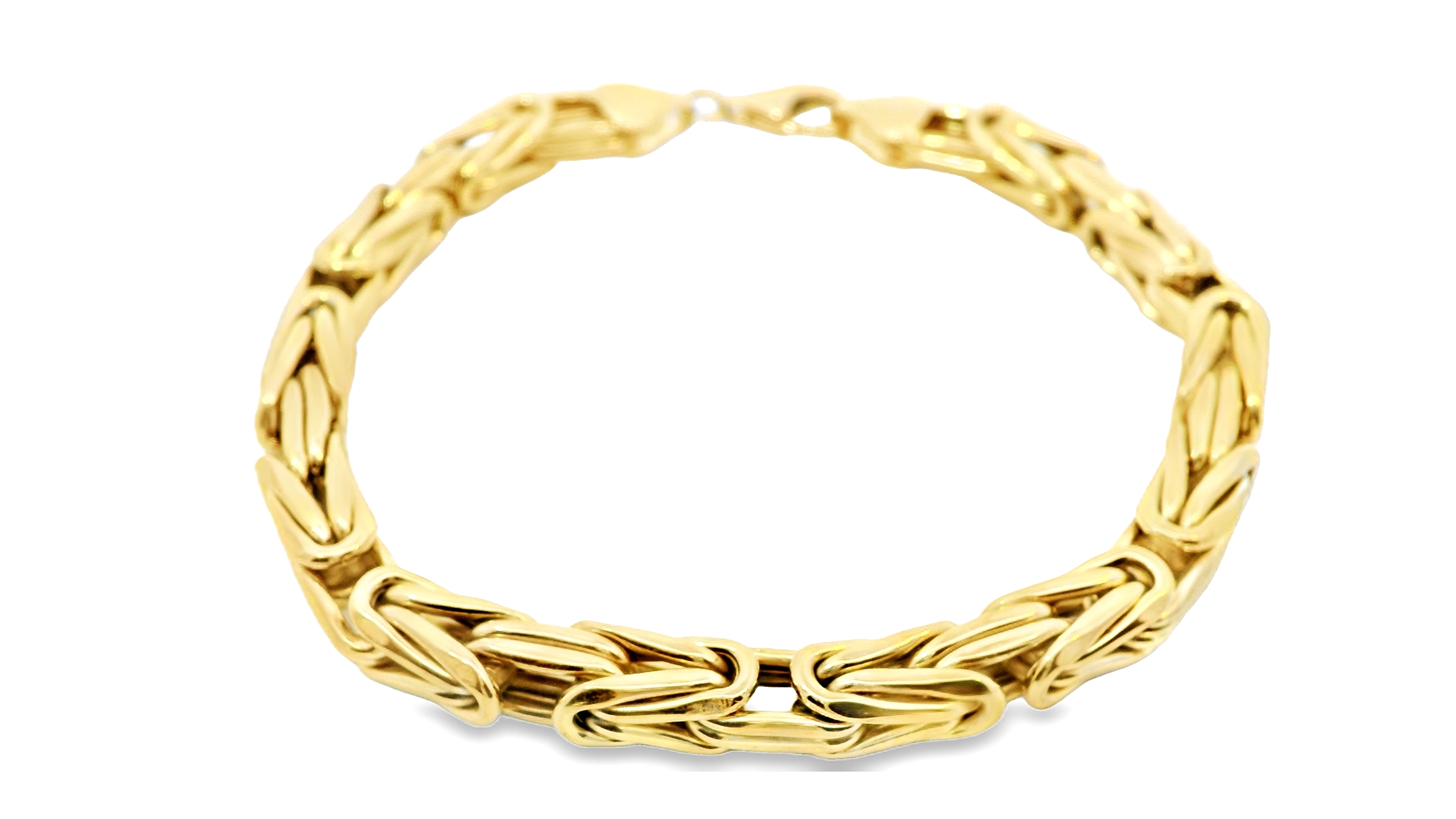 Deze exclusieve 14 karaat geelgouden koningsschakel armband (17.86 gr) is een prachtig sieraad dat luxe en vakmanschap combineert. De koningsschakel, bekend om zijn verfijnde en robuuste ontwerp, bestaat uit kunstig met elkaar verweven schakels, wat zorgt voor een stoere maar elegante uitstraling.