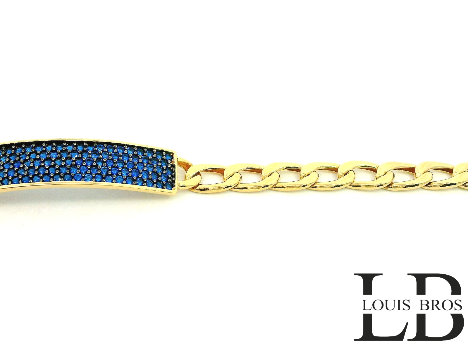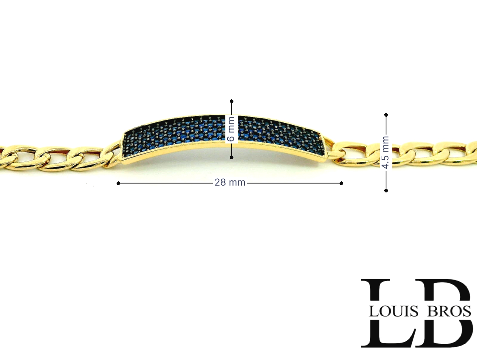 Deze verfijnde armband is vervaardigd uit 14 karaat geelgoud (4.5 gr) en straalt luxe en elegantie uit. Het middendeel is bezet met fonkelende blauwe zirkonia’s die prachtig contrasteren met het warme goud, wat zorgt voor een opvallende en stijlvolle uitstraling. De combinatie van klassieke schakels en het moderne accent van de edelstenen maakt deze armband tot een uniek en tijdloos sieraad.