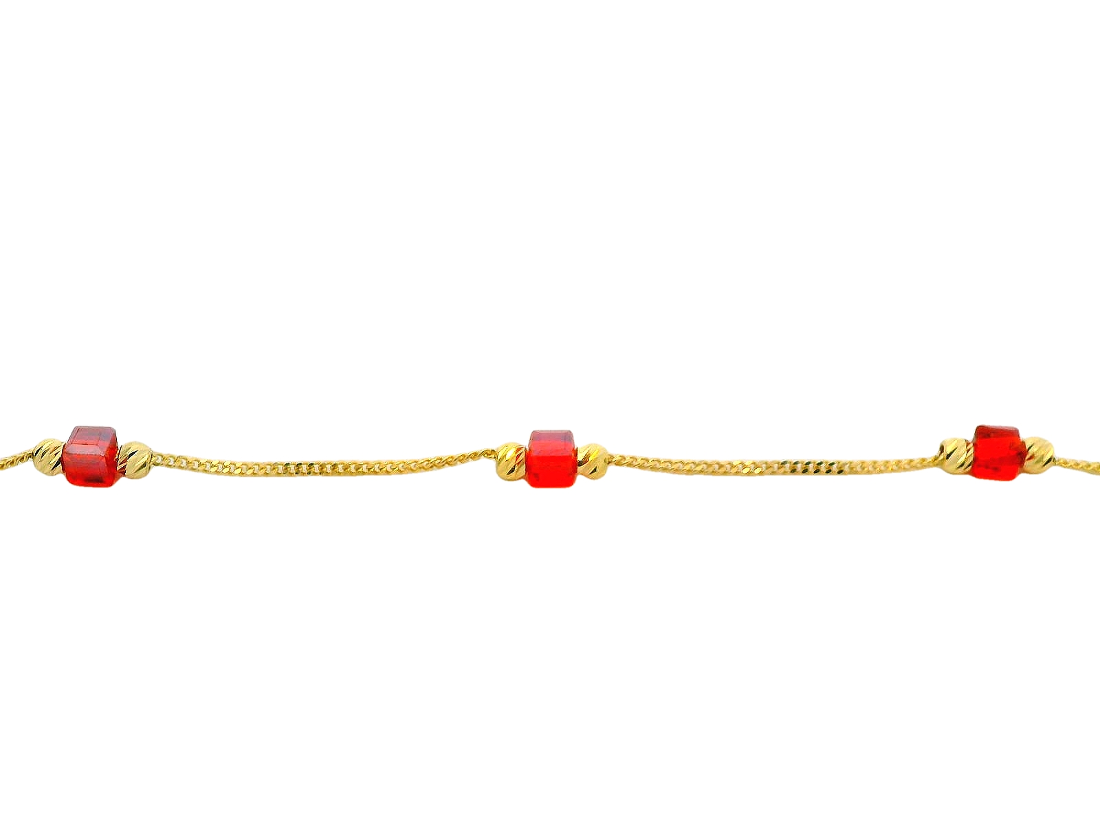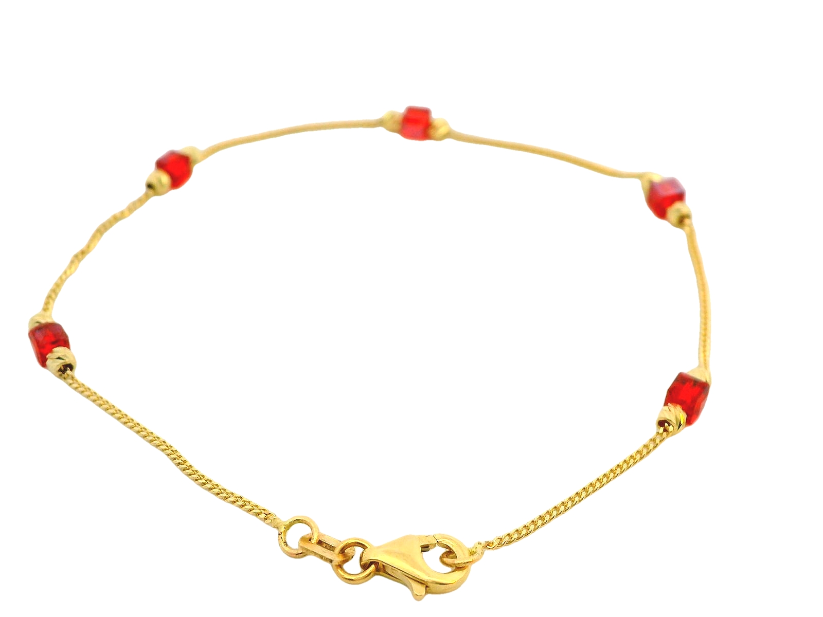 Deze subtiele armband is een verfijnd sieraad dat uitblinkt door zijn eenvoud en elegantie. De fijne gouden band is verrijkt met delicate rode steentjes, die een warme en levendige kleuraccent toevoegen. Het tijdloze ontwerp maakt het een perfect accessoire voor dagelijks gebruik, terwijl de rode steentjes een vleugje speelsheid en luxe toevoegen. Ideaal om alleen te dragen of te combineren met andere sieraden voor een verfijnde look.