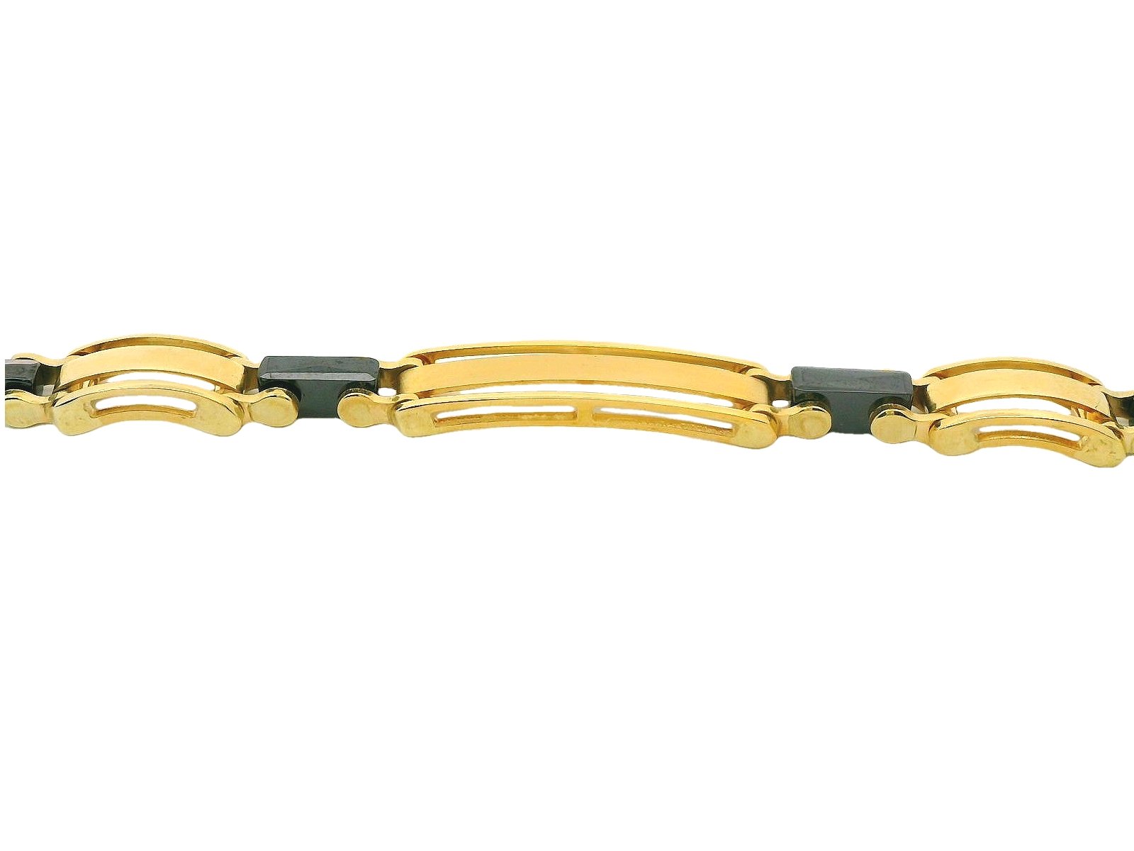 Deze stijlvolle geelgouden armband voor heren is verrijkt met zwarte keramieke accenten, wat een krachtig en modern contrast creëert. Het robuuste ontwerp combineert de luxe uitstraling van goud met de stoere, eigentijdse look van keramiek. Perfect voor de man die houdt van verfijnde accessoires met een unieke twist. Deze armband is een statement piece dat zowel kracht als elegantie uitstraalt, ideaal voor zowel dagelijks gebruik als speciale gelegenheden.