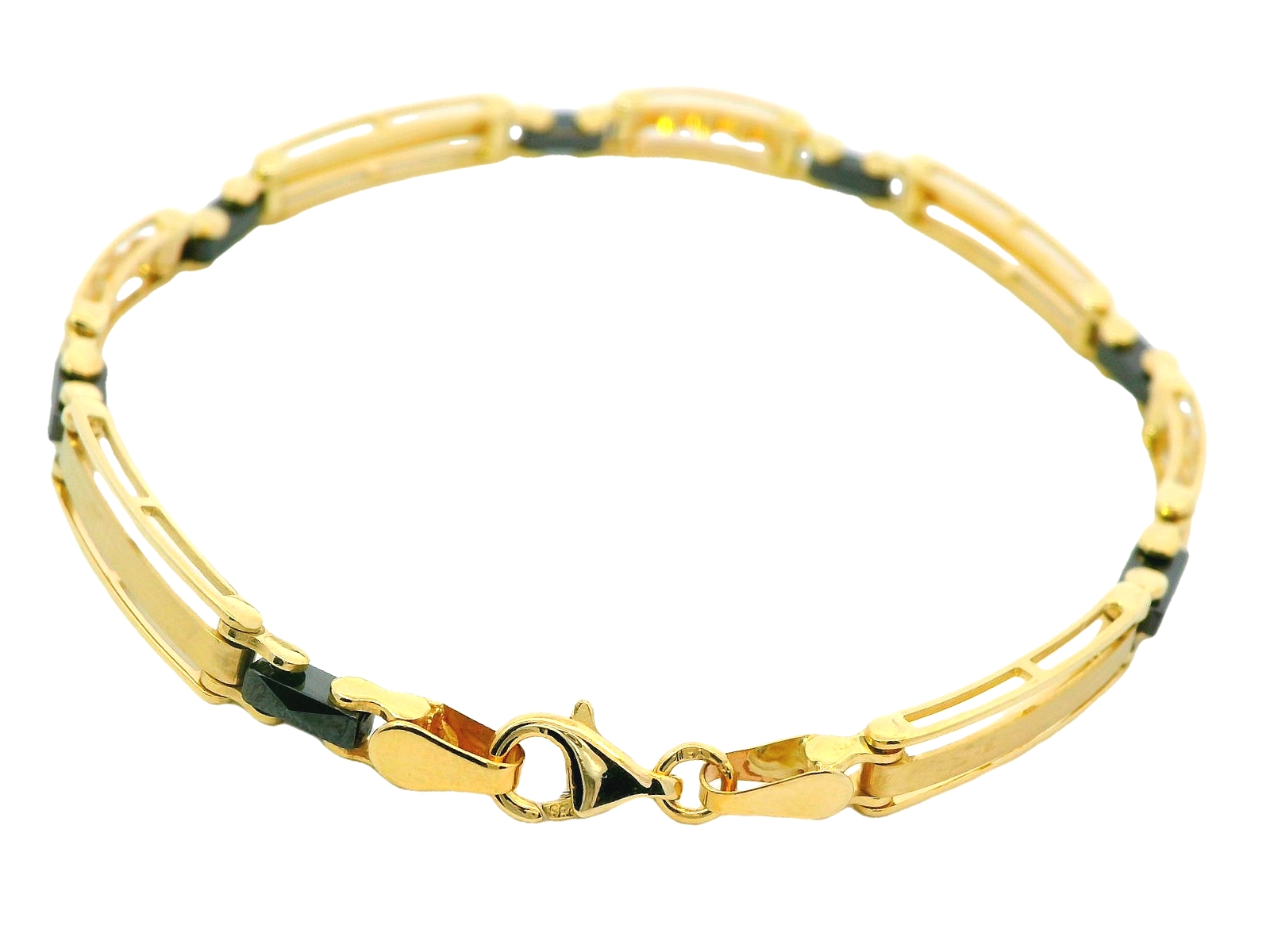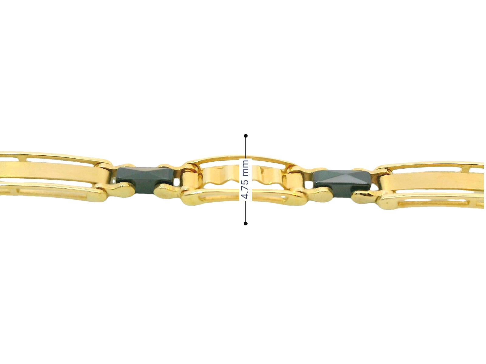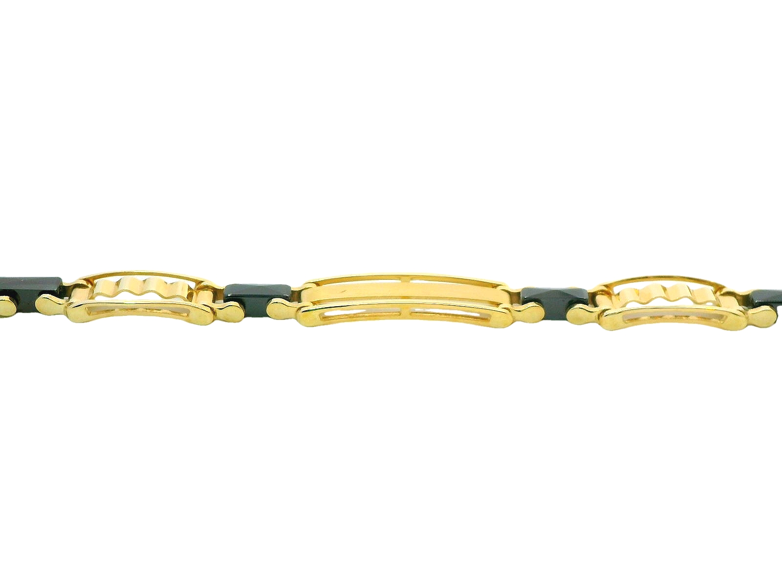 Deze stijlvolle geelgouden armband voor heren is verrijkt met zwarte keramieke accenten, wat een krachtig en modern contrast creëert. Het robuuste ontwerp combineert de luxe uitstraling van goud met de stoere, eigentijdse look van keramiek. Perfect voor de man die houdt van verfijnde accessoires met een unieke twist. Deze armband is een statement piece dat zowel kracht als elegantie uitstraalt, ideaal voor zowel dagelijks gebruik als speciale gelegenheden.