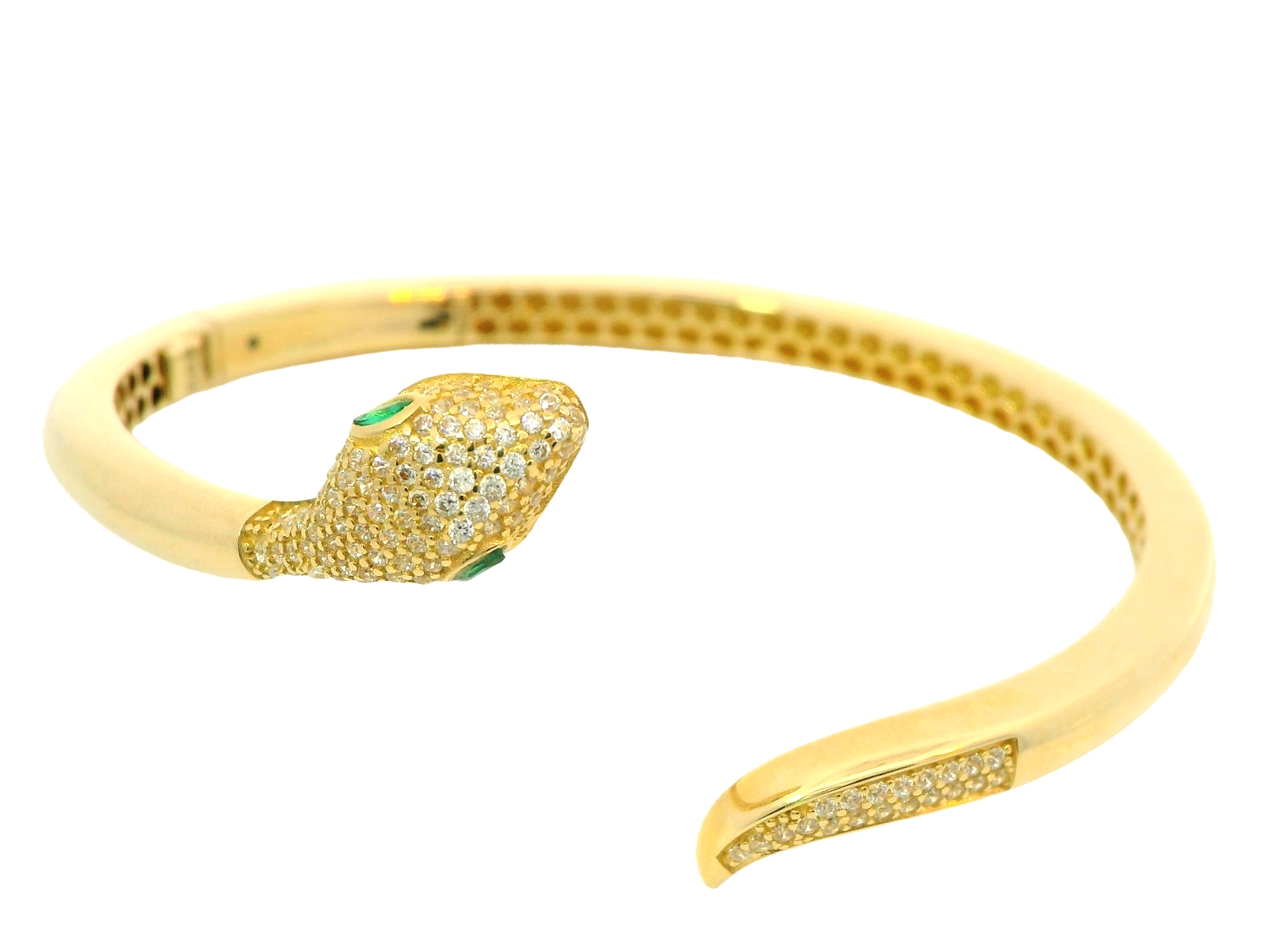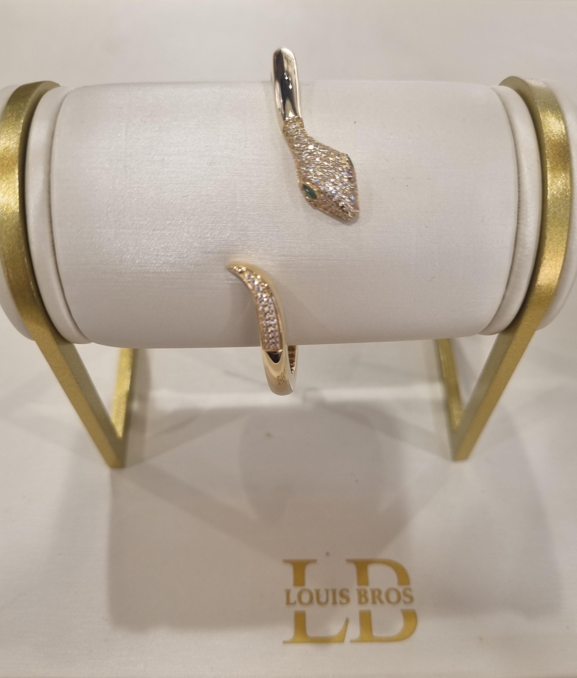 Deze armband is een echte blikvanger. Het elegante ontwerp, versierd met fonkelende zirkonia's, geeft de armband een luxe uitstraling. Het slangenmotief symboliseert kracht en mysterie, terwijl de geelgouden afwerking een tijdloze charme toevoegt. Perfect voor zowel dagelijkse draagbaarheid als bijzondere gelegenheden, voegt deze armband een vleugje verfijning en glamour toe aan elke look. Met zijn hoogwaardige materialen en verfijnde afwerking is deze armband een prachtige toevoeging aan elke sieradencollectie.