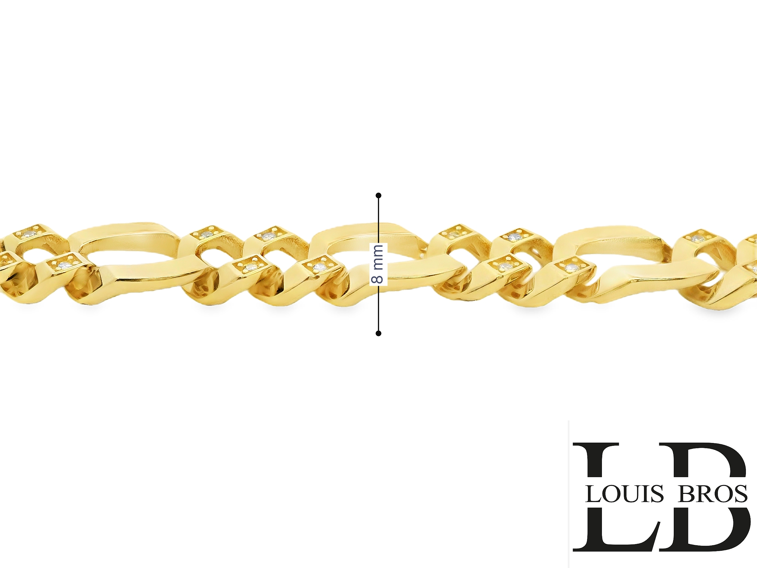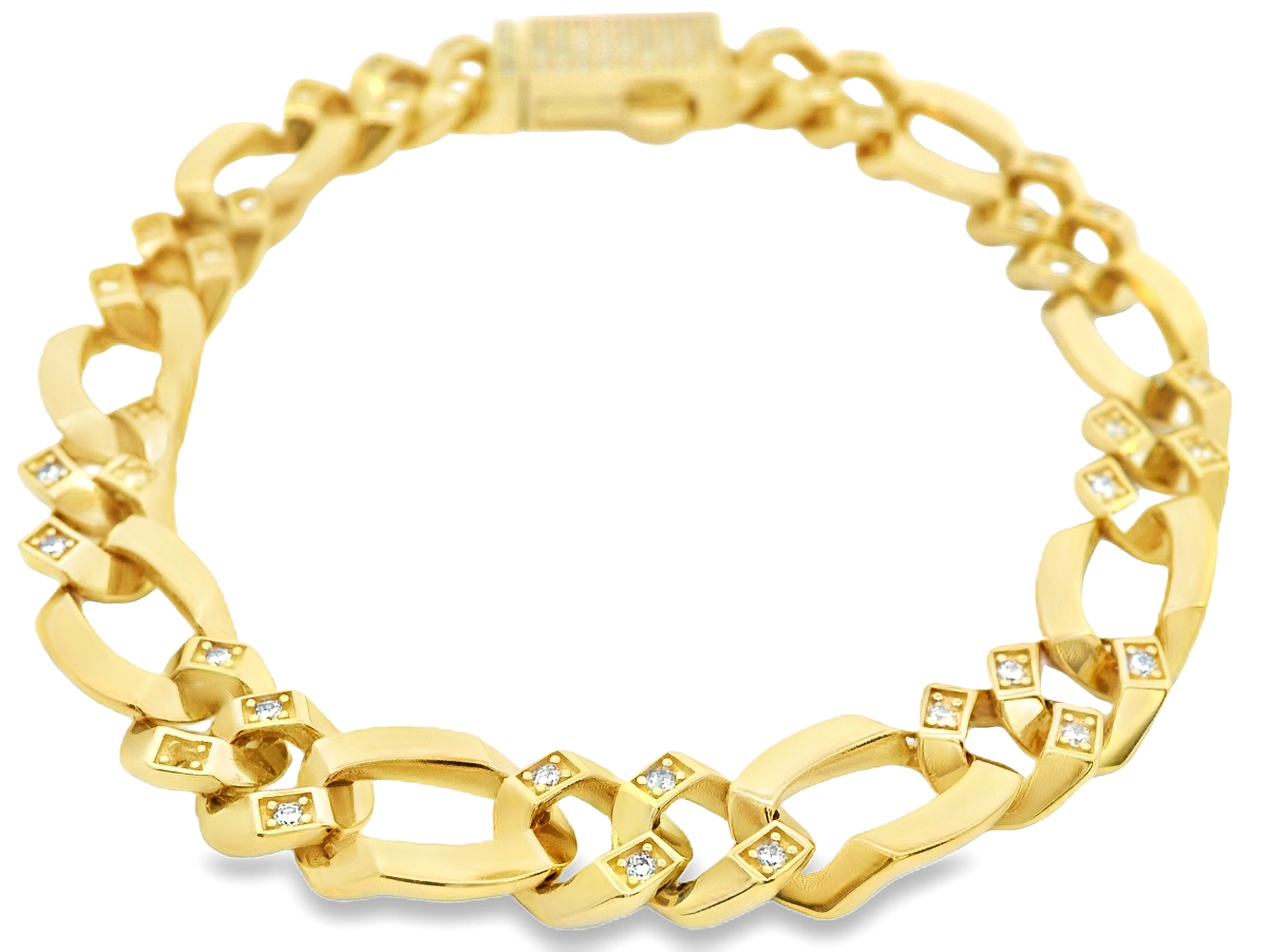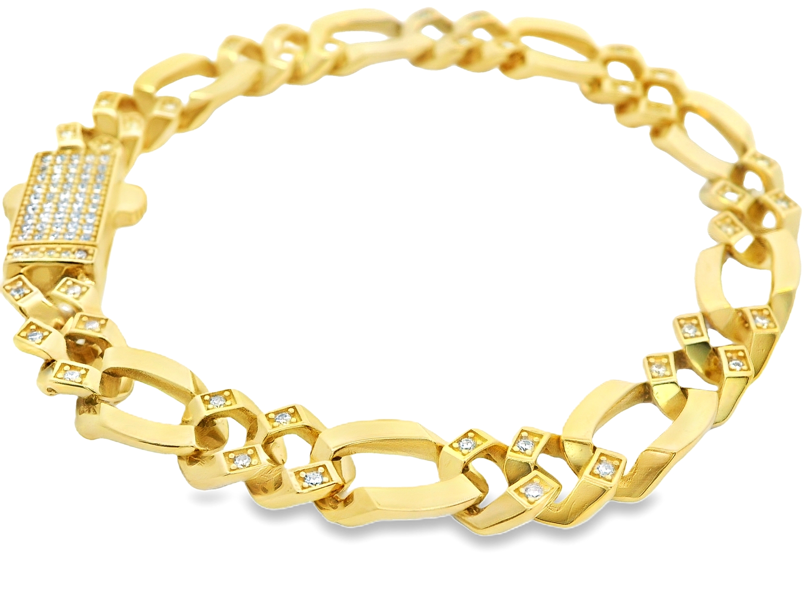 Deze elegante armband is vervaardigd uit hoogwaardig 14 karaat geelgoud (15.23 gr) en straalt luxe en verfijning uit. De schakels zijn stijlvol vormgegeven met een moderne twist op de klassieke figaro- of kubaanse schakelstijl, wat zorgt voor een opvallende en tijdloze uitstraling. Wat deze armband extra bijzonder maakt, zijn de schitterende zirkonia-steentjes die zorgvuldig zijn ingelegd in meerdere schakels én op de sluiting. De steentjes vangen het licht prachtig op en geven de armband een subtiele, maar luxe schittering.