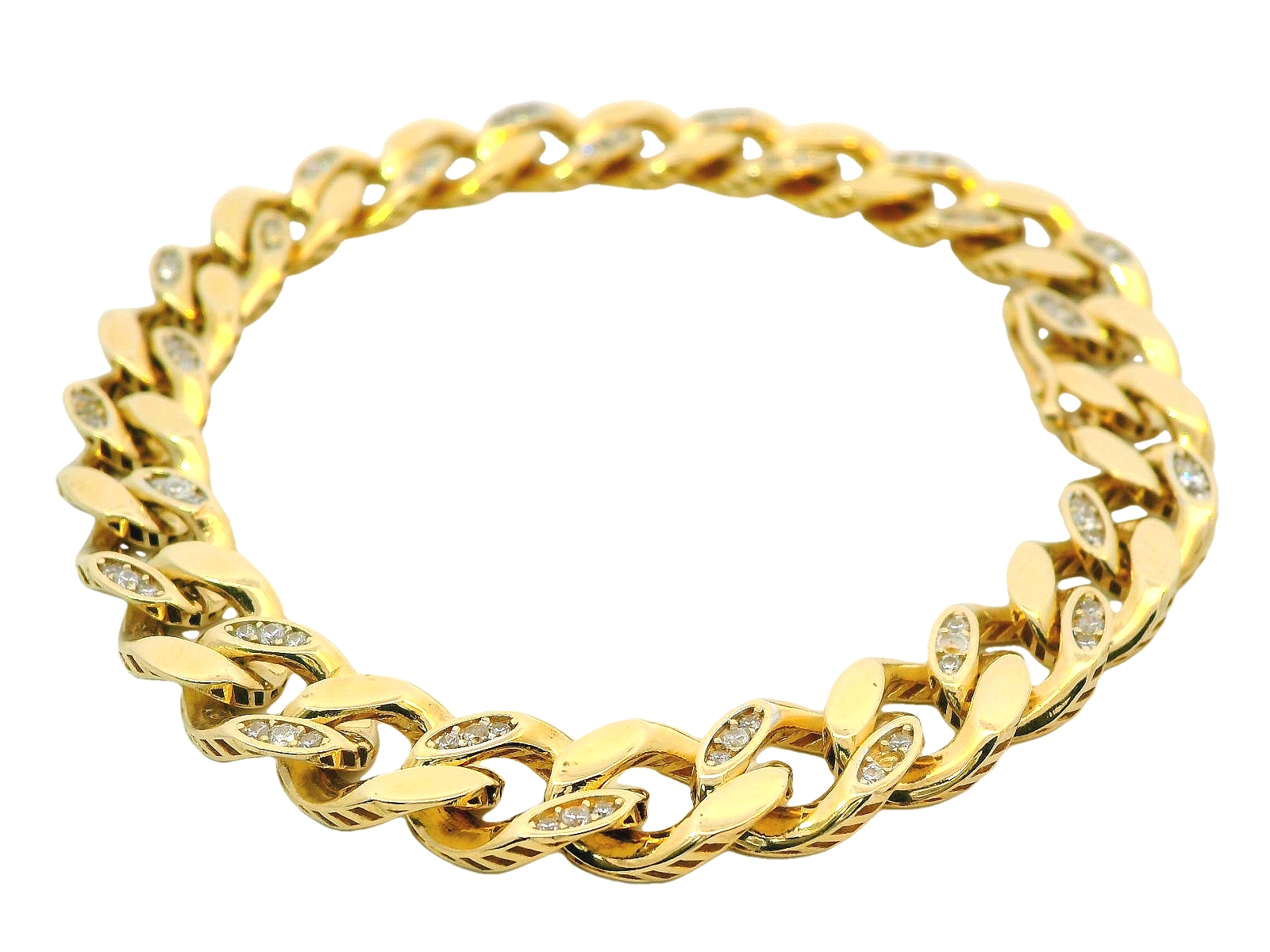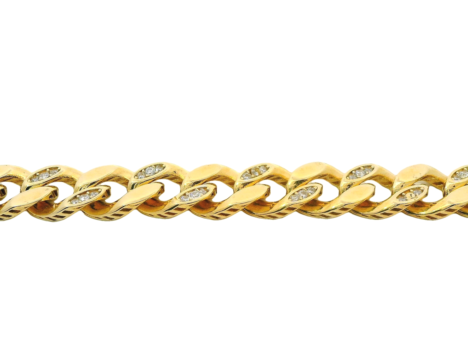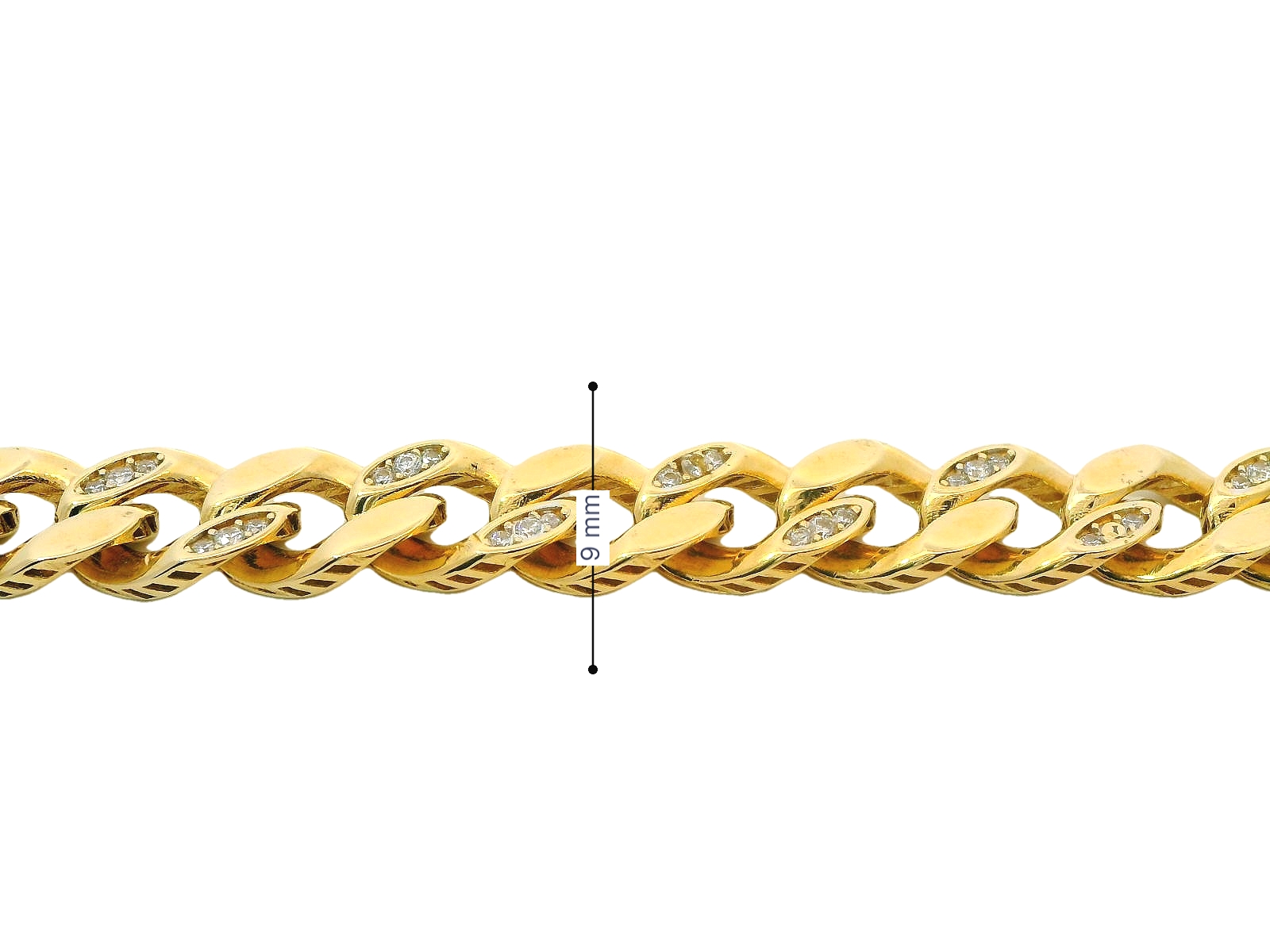 Deze gourmet armband met zirkonia's is een stijlvolle en veelzijdige accessoire voor zowel mannen als vrouwen. Het luxe 14-karaats geelgoud zorgt voor een warme, tijdloze uitstraling, terwijl de zorgvuldig gezette zirkonia's schitteren en een vleugje glamour toevoegen. Het robuuste gourmet design, met zijn kenmerkende platte, verweven schakels, maakt de armband geschikt voor dagelijks gebruik of speciale gelegenheden. Deze unisex armband combineert elegantie en duurzaamheid, perfect om elke outfit naar een hoger niveau te tillen.