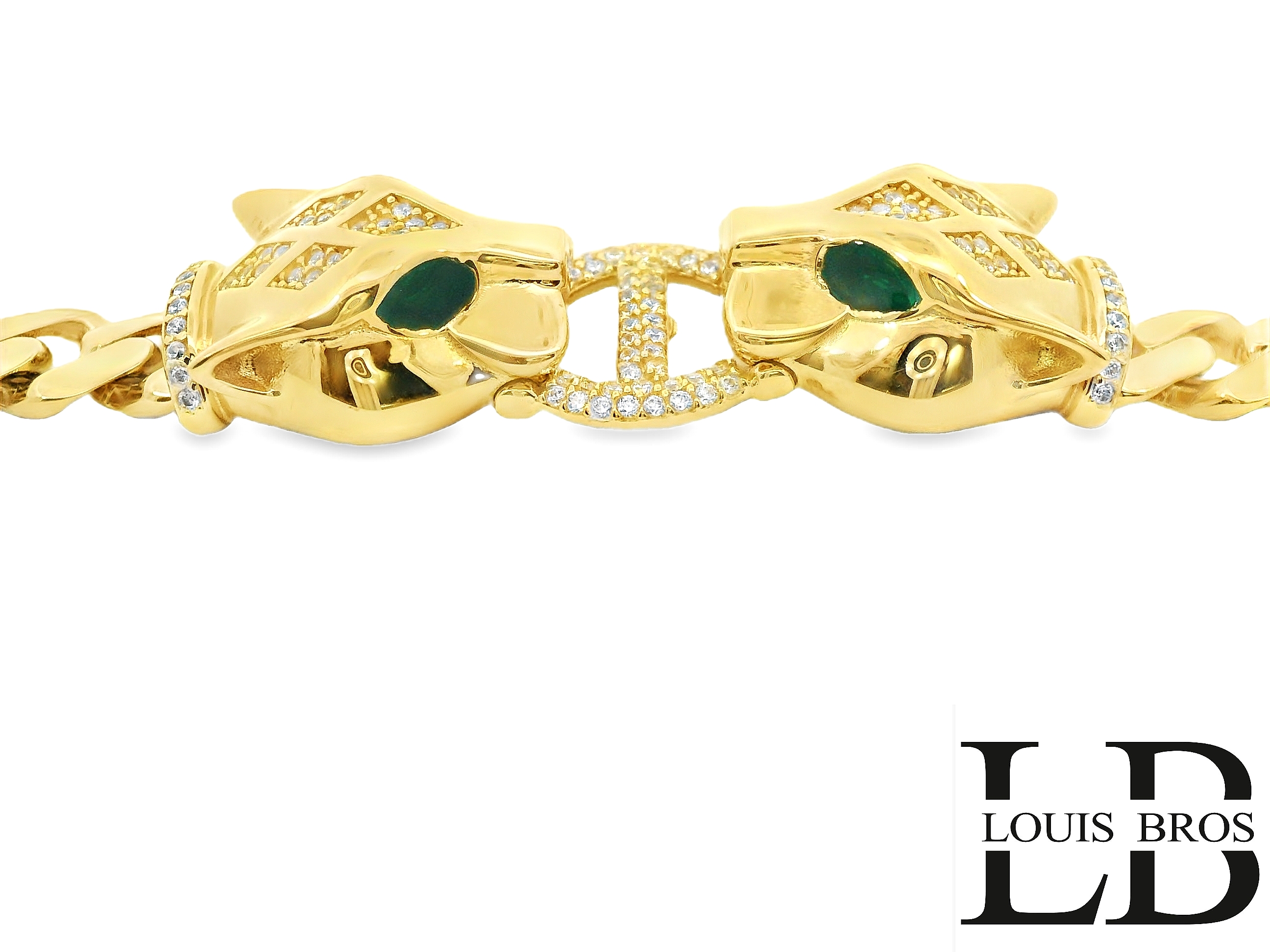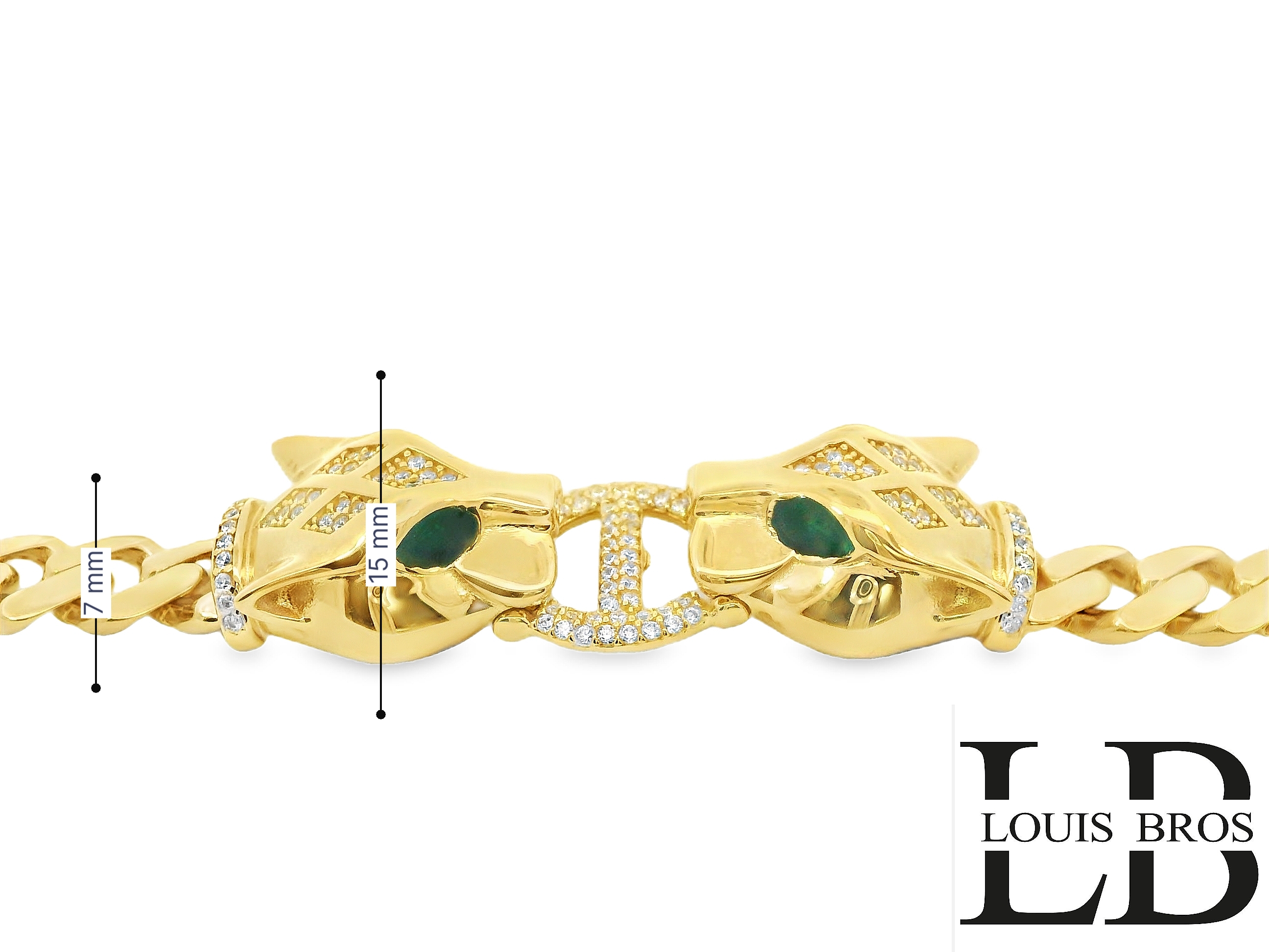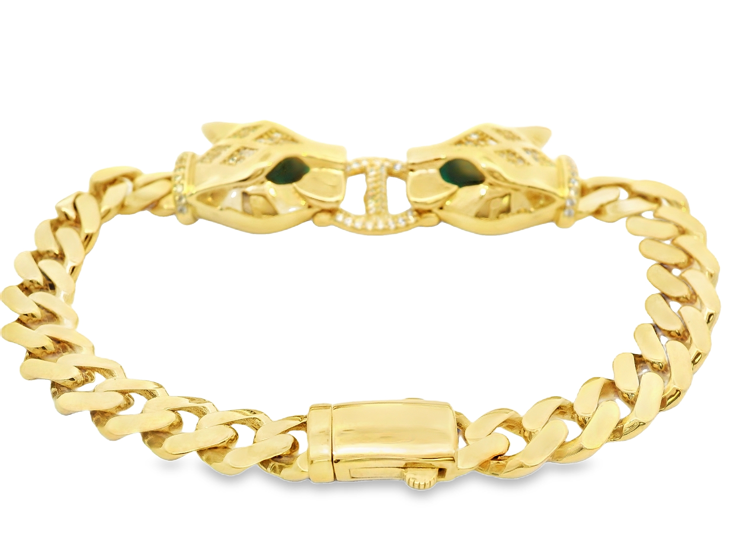 De ogen van de panters zijn bezet met donkergroene stenen, wat een mysterieus en luxueus accent geeft aan het geheel. De koppen zelf zijn rijkelijk versierd met fonkelende zirkonia-steentjes die zorgen voor een schitterend contrast tegen het warme geelgoud. De armband sluit met een stevige en onopvallende gouden sluiting die perfect past bij het robuuste karakter van het sieraad.