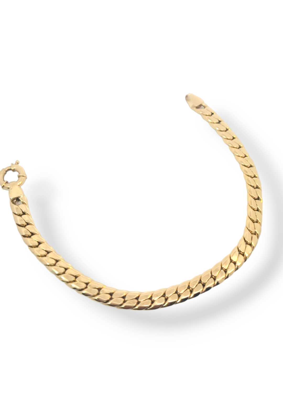 Deze schakelarmband van Louis Bros is vervaardigd uit 14 karaat geelgoud (8.62 gr.). De armband heeft een lengte van 19 cm en breedte van 5.70 mm. En een dikte van 2.40 mm. Deze armband is stijlvol, eenvoudig en gemakkelijk te combineren. De sieraden vormen enerzijds een prachtige basis voor een minimalistische look, of kunnen anderzijds uitgebreid worden met verschillende type sieraden voor een rijke en of een feestelijke uitstraling.