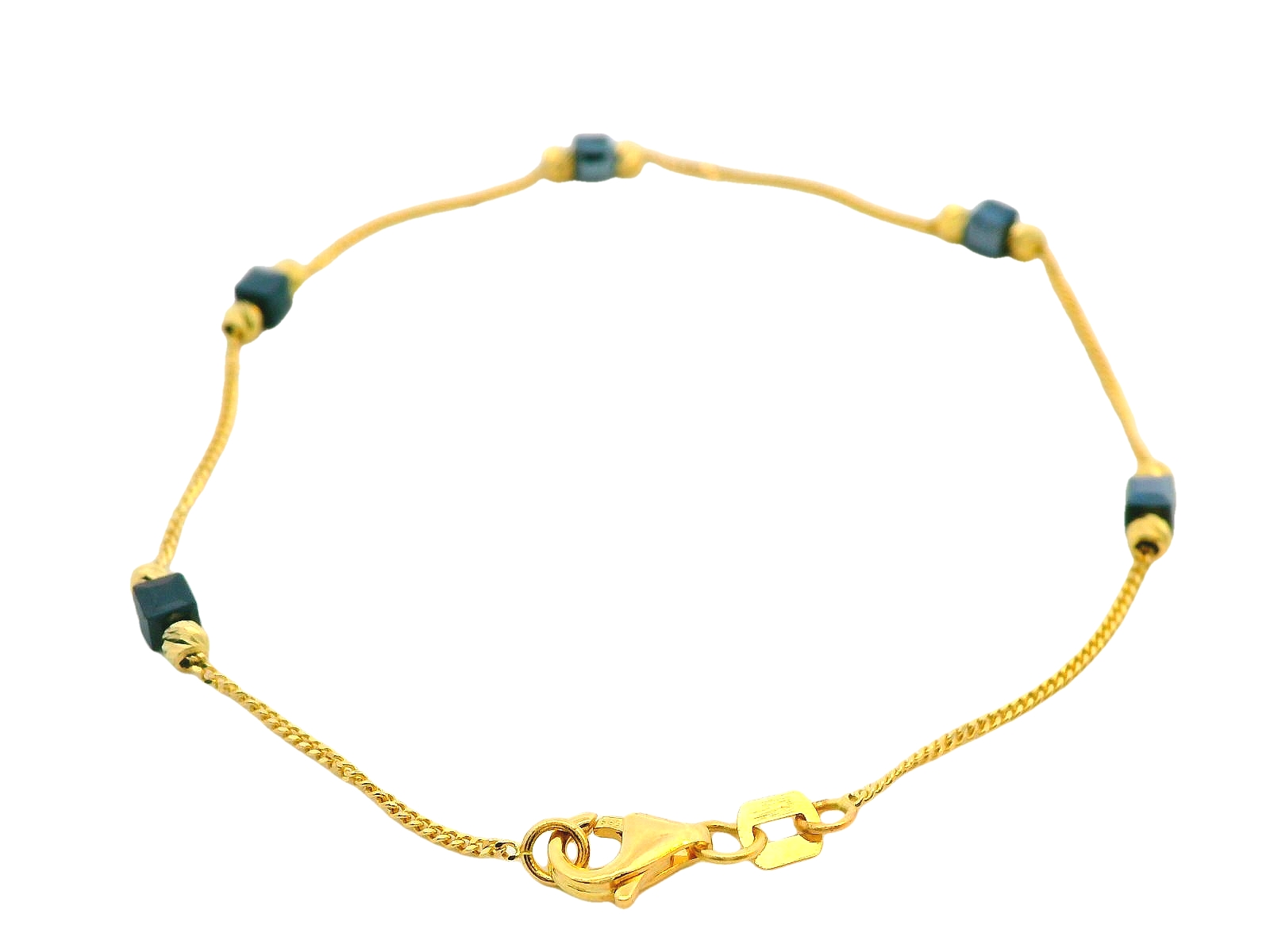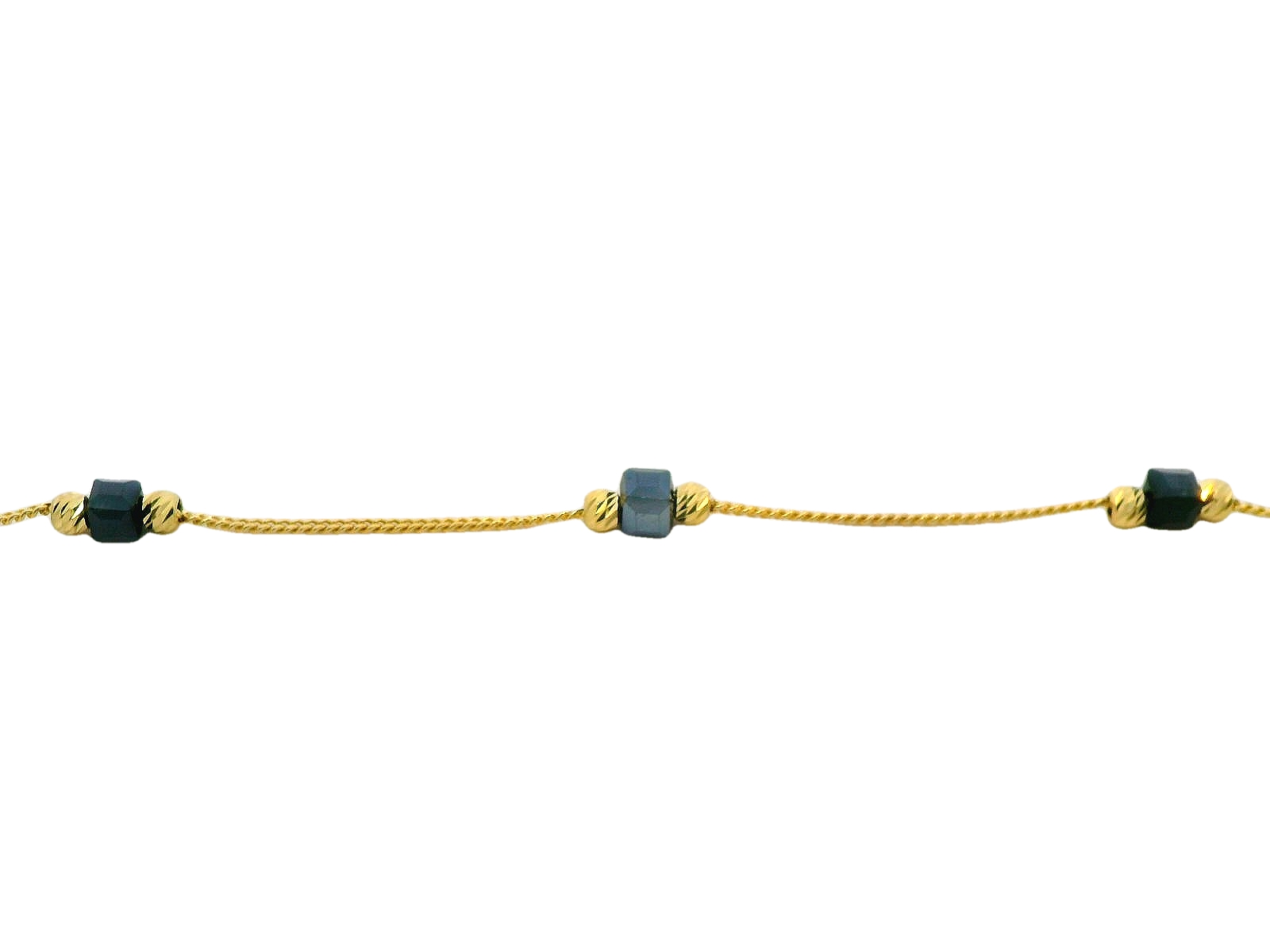 Deze subtiele armband combineert verfijning met een moderne twist. De fijne gouden band is versierd met elegante zwarte steentjes, die een stijlvol contrast creëren en het sieraad een mysterieuze en chique uitstraling geven. Het minimalistische ontwerp maakt het perfect voor dagelijks gebruik, terwijl de zwarte steentjes zorgen voor een eigentijdse en veelzijdige touch. Een prachtig accessoire dat elke outfit subtiel verrijkt.
