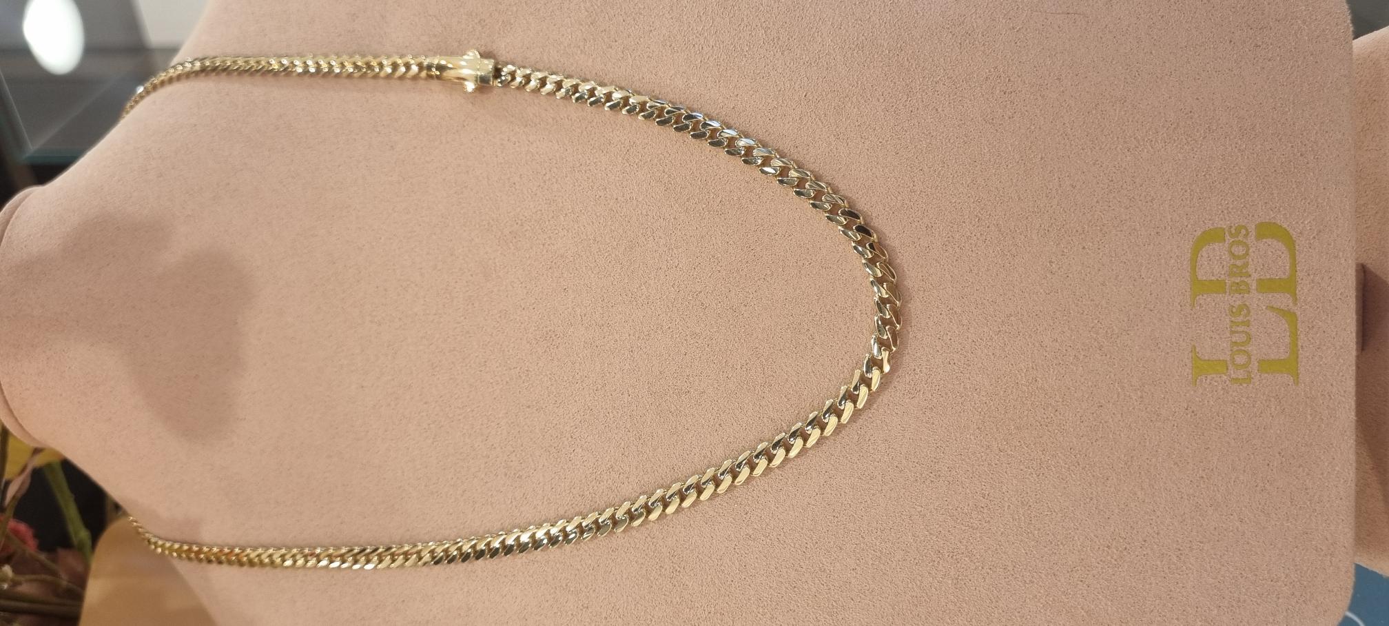 Dit collier van Louis Bros is vervaardigd uit 14 karaat geelgoud (28. gr). Het collier heeft een lengte van 65 cm en een dikte van 2 mm.