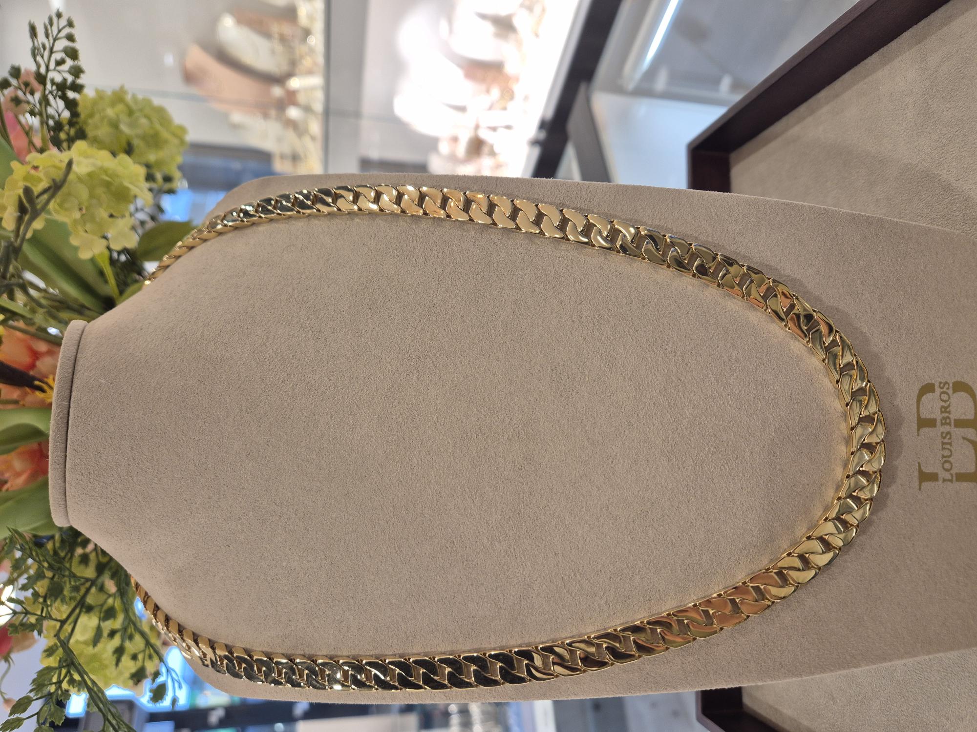Dit collier van Louis Bros is vervaardigd uit 14 karaat geelgoud (61.44 gr). Het collier heeft een lengte van 65 cm en een dikte van 3 mm.