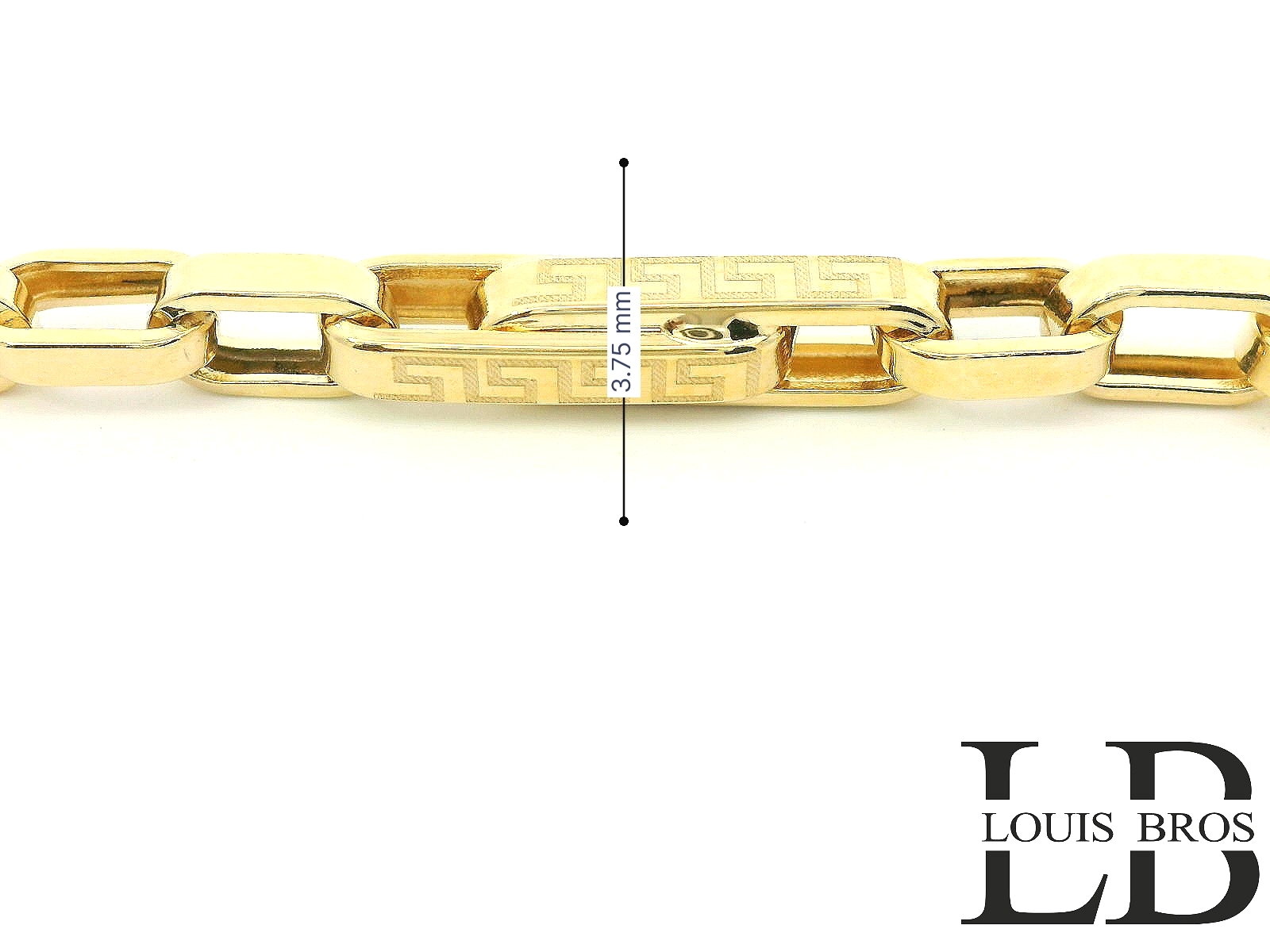 Dit verfijnde heren collier is vervaardigd uit 14 karaat geelgoud (12.36 gr) en straalt pure luxe en klasse uit. De schakels hebben een strakke, rechthoekige vorm met subtiele openingen die zorgen voor een robuuste, doch elegante uitstraling. Wat dit collier extra bijzonder maakt, is het verfijnde gravurepatroon op sommige schakels, dat een vleugje exclusiviteit en karakter toevoegt.