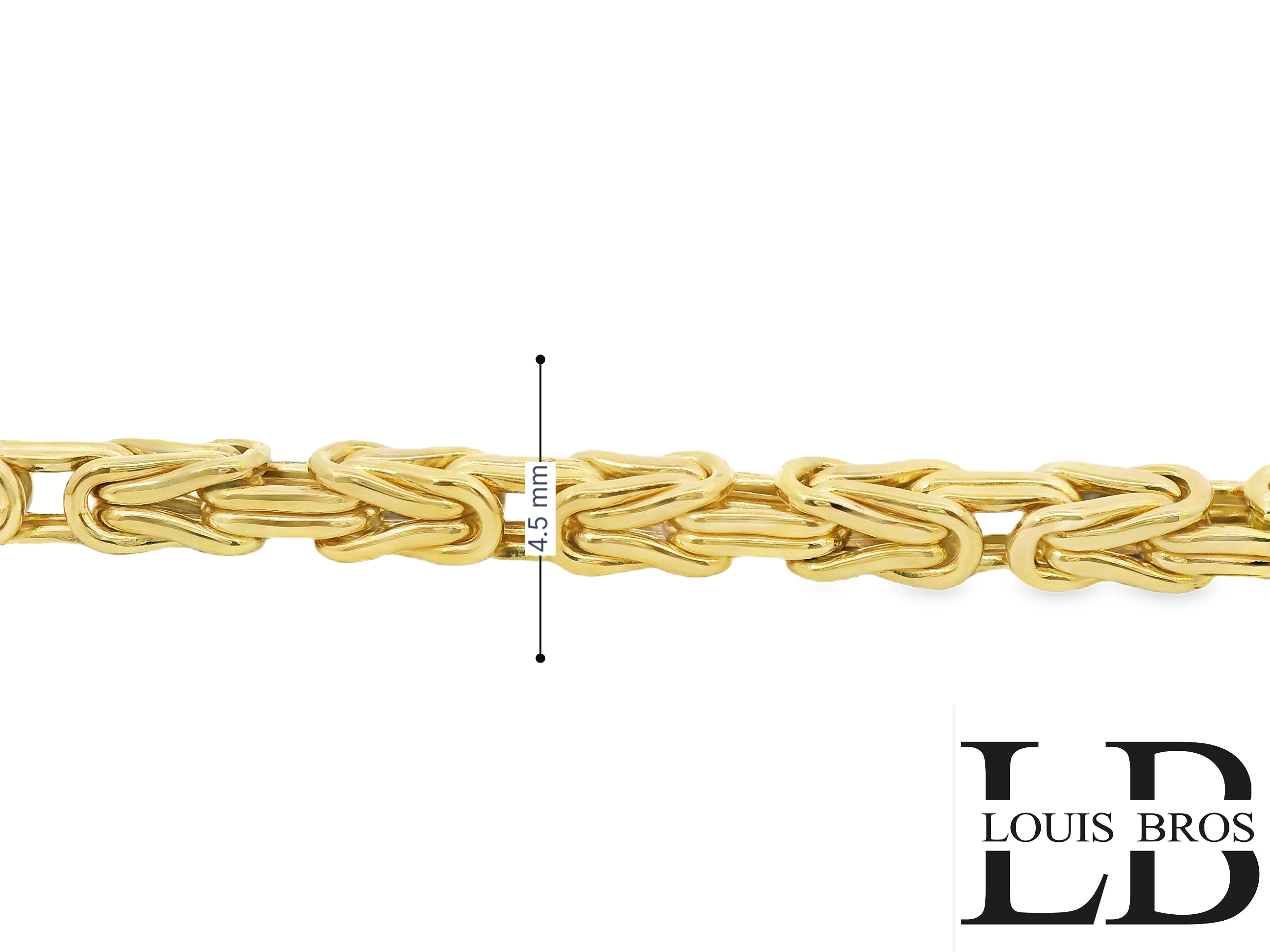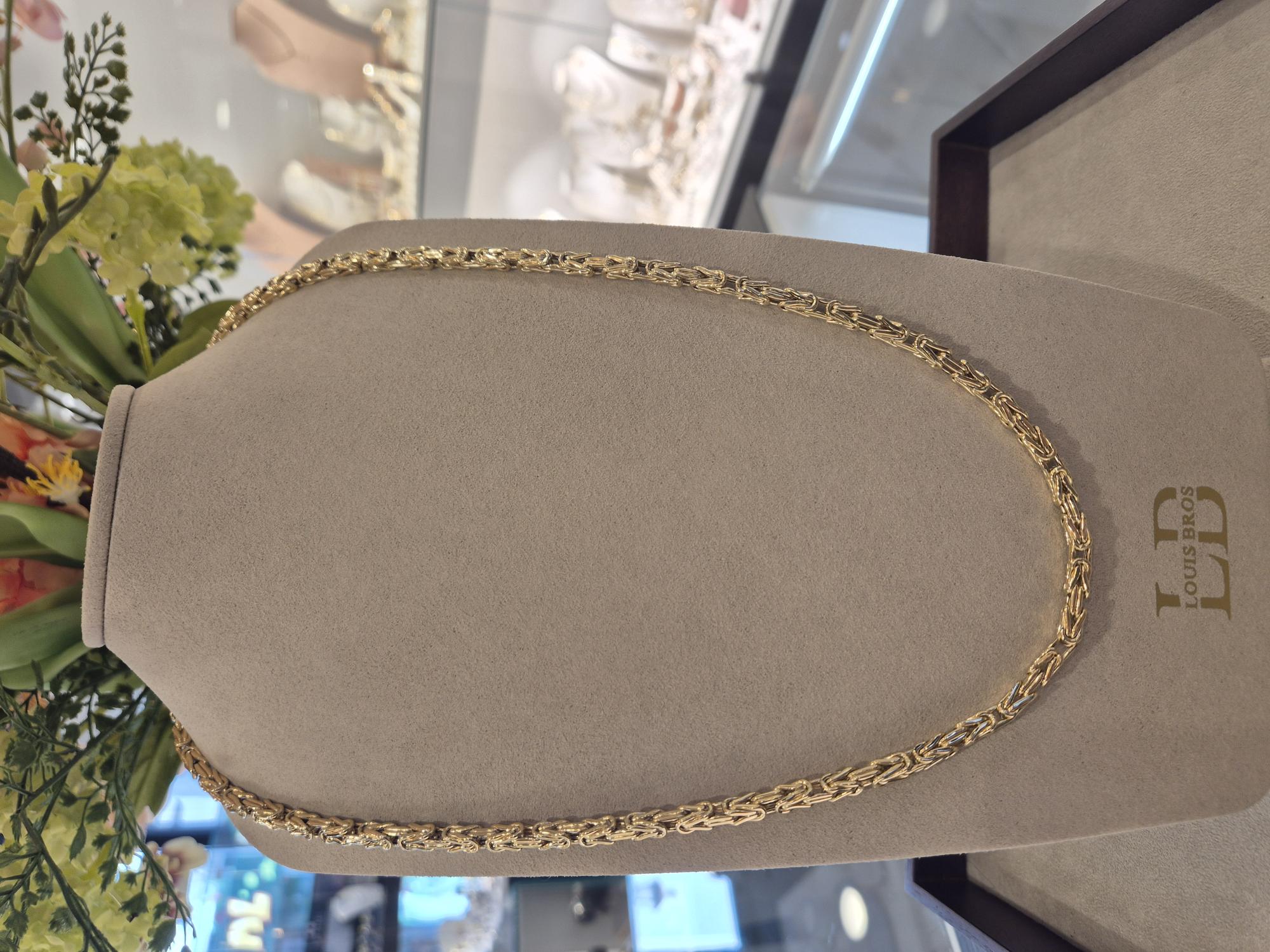 Dit prachtige geelgouden collier is vervaardigd uit 14 karaat goud (32.59 gr) en uitgevoerd in de klassieke en karakteristieke koningsschakel. De koningsschakel staat bekend om zijn robuuste, sierlijke structuur waarbij de schakels op verfijnde wijze in elkaar grijpen. Dit geeft het collier een luxe, elegante uitstraling met een subtiele twist van vakmanschap.