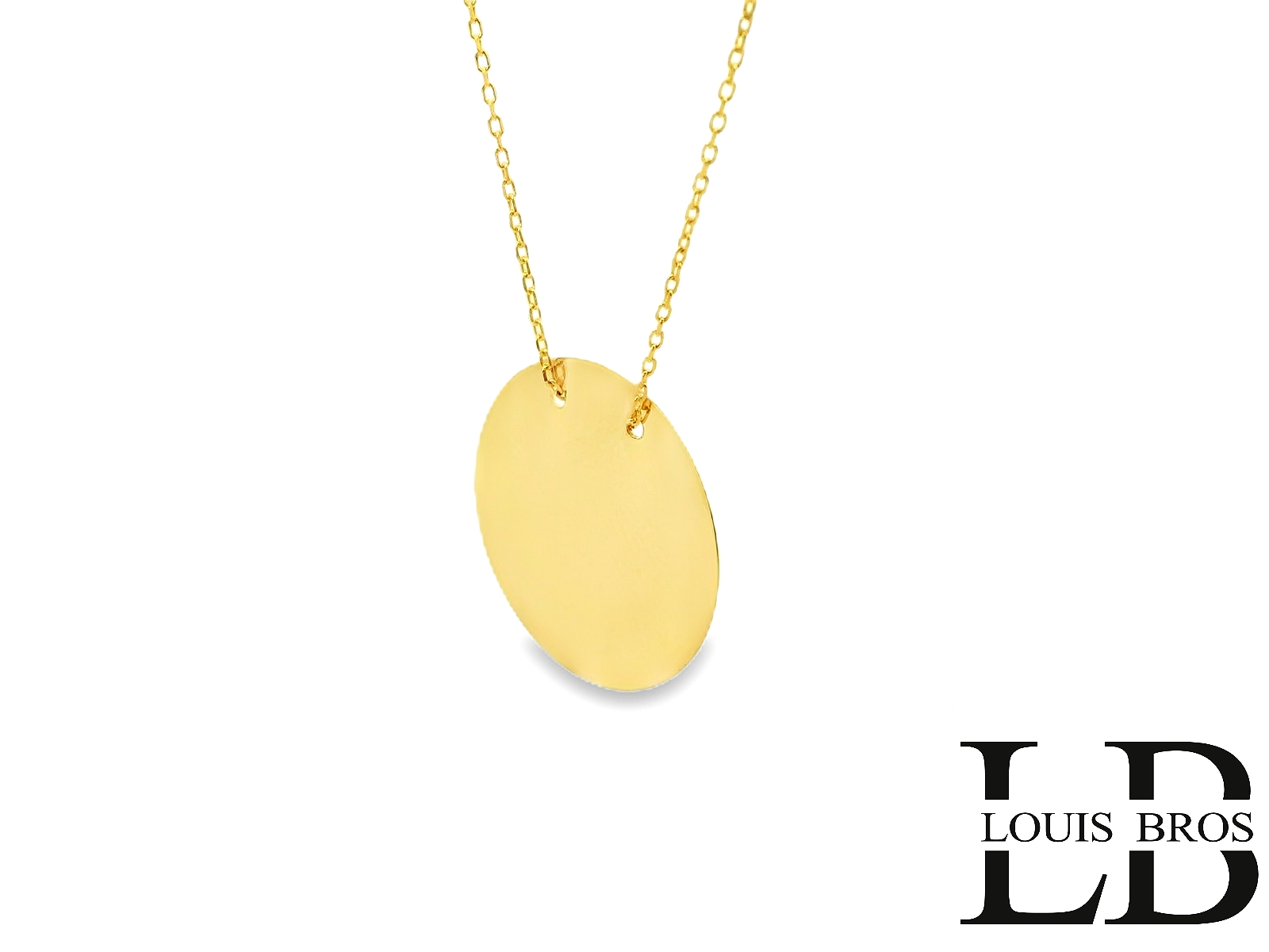 Dit prachtige geelgouden collier is vervaardigd uit 14 karaat goud (2.46 gr) en straalt tijdloze elegantie uit. De fijne gouden ketting wordt prachtig geaccentueerd door een ronde hanger in de vorm van een graveerplaat, ideaal om te personaliseren met een naam, datum of betekenisvolle boodschap. De glanzende afwerking van de hanger zorgt voor een verfijnde uitstraling, terwijl het klassieke ontwerp veelzijdig en stijlvol blijft. Dit collier is een perfect cadeau voor een speciale gelegenheid of een tijdloos sieraad om zelf te koesteren.