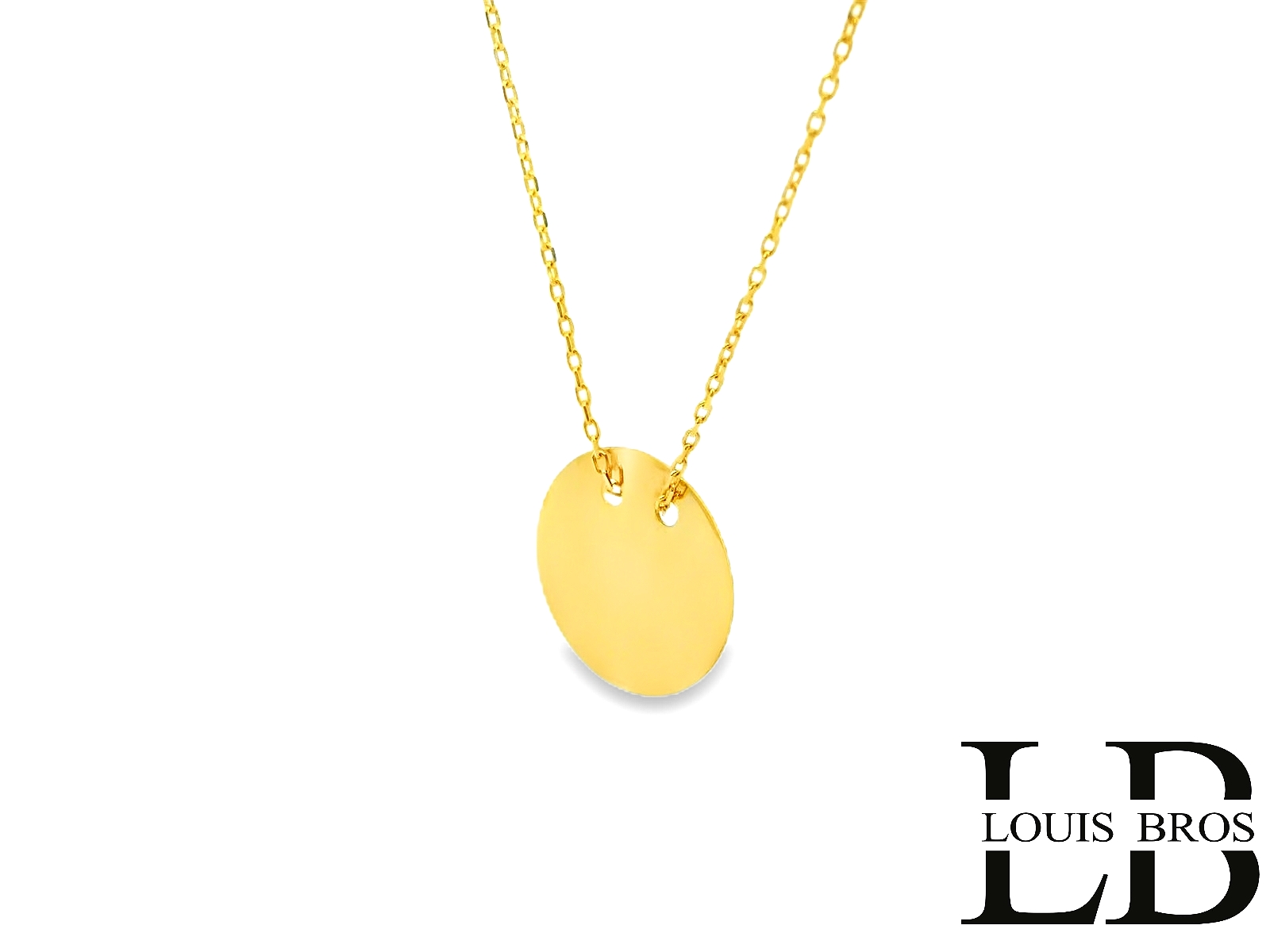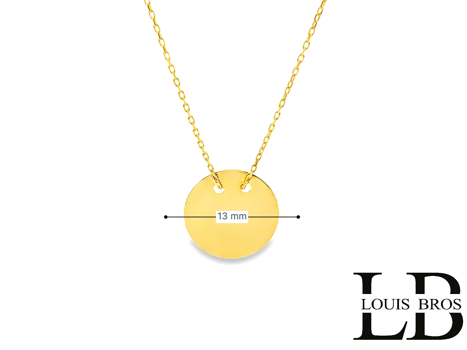 Dit prachtige geelgouden collier is vervaardigd uit 14 karaat goud (1.65 gr) en straalt tijdloze elegantie uit. De fijne gouden ketting wordt prachtig geaccentueerd door een ronde hanger in de vorm van een graveerplaat, ideaal om te personaliseren met een naam, datum of betekenisvolle boodschap. De glanzende afwerking van de hanger zorgt voor een verfijnde uitstraling, terwijl het klassieke ontwerp veelzijdig en stijlvol blijft. Dit collier is een perfect cadeau voor een speciale gelegenheid of een tijdloos sieraad om zelf te koesteren.