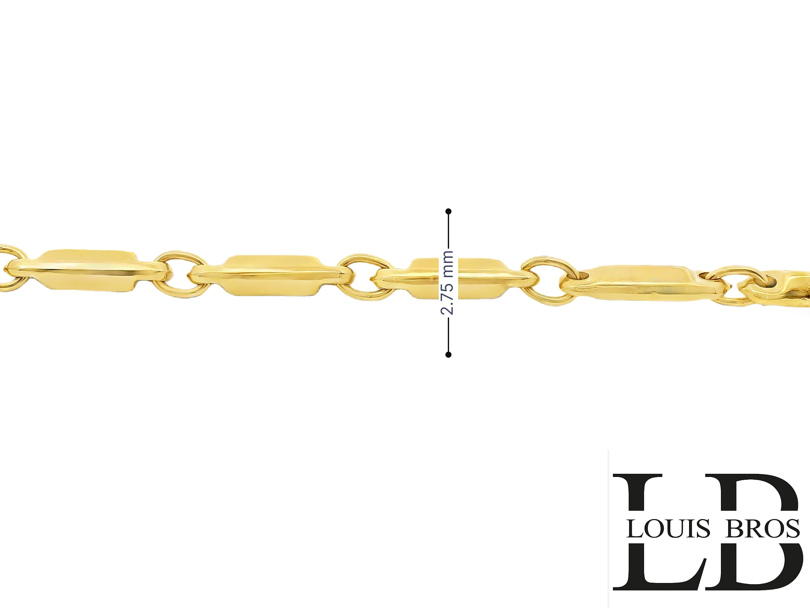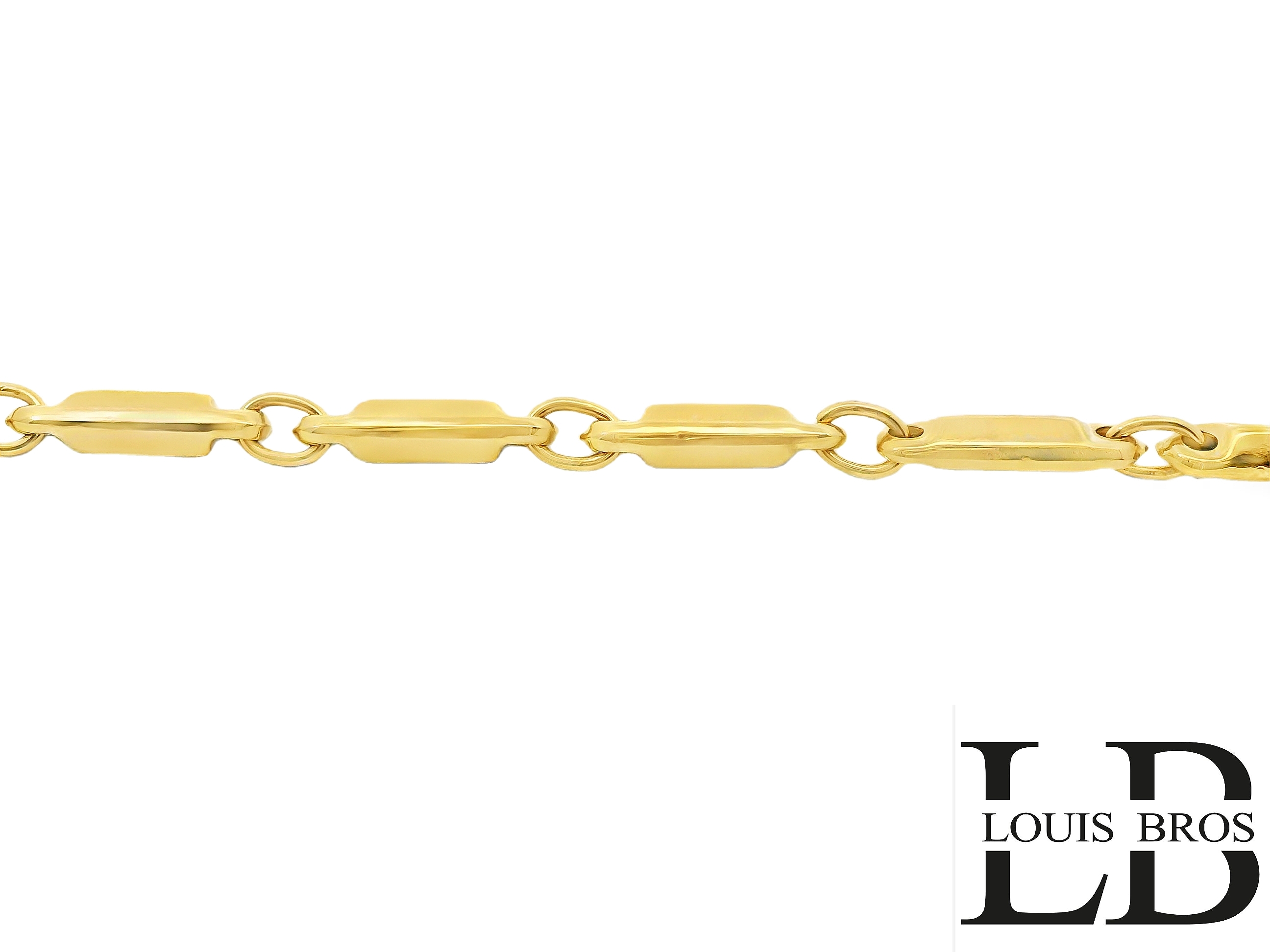 Dit verfijnde collier is vervaardigd uit 14 karaat geelgoud (11.62 gr) en straalt pure elegantie en klasse uit. De ketting bestaat uit strak afgewerkte, langwerpige schakels die met subtiele ringetjes met elkaar verbonden zijn. Dankzij het moderne, doch tijdloze ontwerp is dit sieraad zowel geschikt voor dagelijks gebruik als voor speciale gelegenheden.
