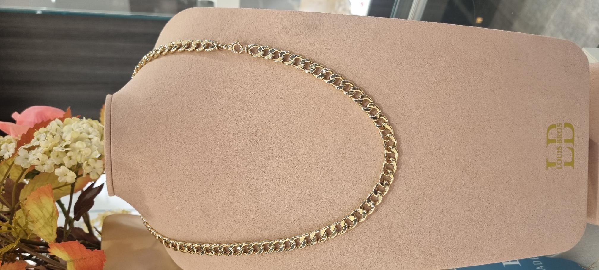 Dit collier van Louis Bros is vervaardigd uit 14 karaat geelgoud (37.90 gr.). Het collier heeft een lengte van 60 cm en een breedte van 9.5 mm. En een dikte van 3 mm.