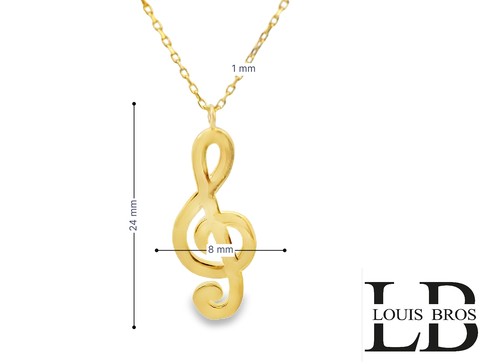 Dit elegante geelgouden collier (1.85 gr) met G-sleutel hanger is een prachtig sieraad voor muziekliefhebbers en artiesten. Gemaakt van 14 karaat goud, straalt dit collier luxe en verfijning uit. De hanger heeft een sierlijke en vloeiende vorm, waardoor het een tijdloos en stijlvol symbool van muziek en creativiteit is.