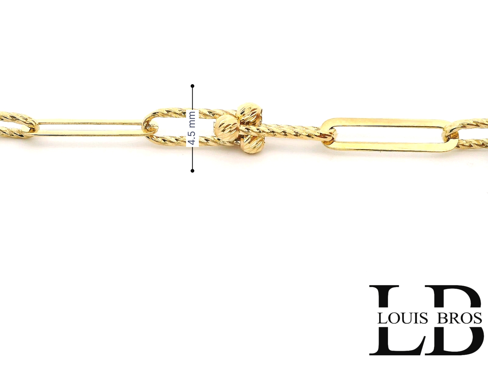 Deze verfijnde armband is vervaardigd uit 14 karaat geelgoud (5.36 gr) en is een echte blikvanger dankzij het unieke schakelontwerp. De armband combineert gedraaide koordelementen met rechte, ovale schakels, stijlvol verbonden door decoratieve gouden knopen. Dit speelse maar elegante patroon geeft het sieraad een chique en vrouwelijke uitstraling.