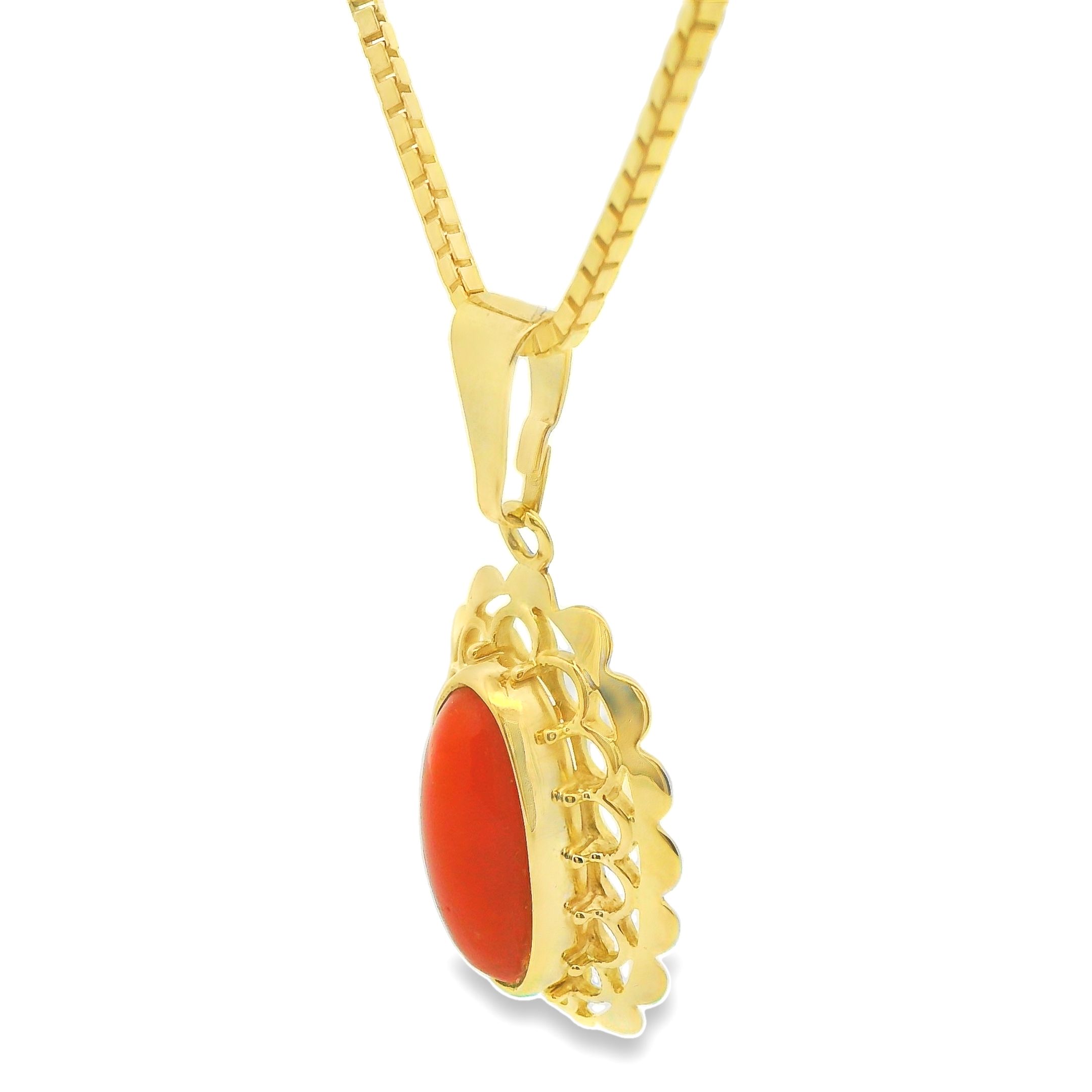 Deze hanger is vervaardigd uit 14 karaat geelgoud (2.55 gr.) en versierd met een bloedkoraal. De hanger is tweedehands en heeft een aantrekkelijke vintage uitstraling, wat hem een uniek en tijdloos karakter geeft.