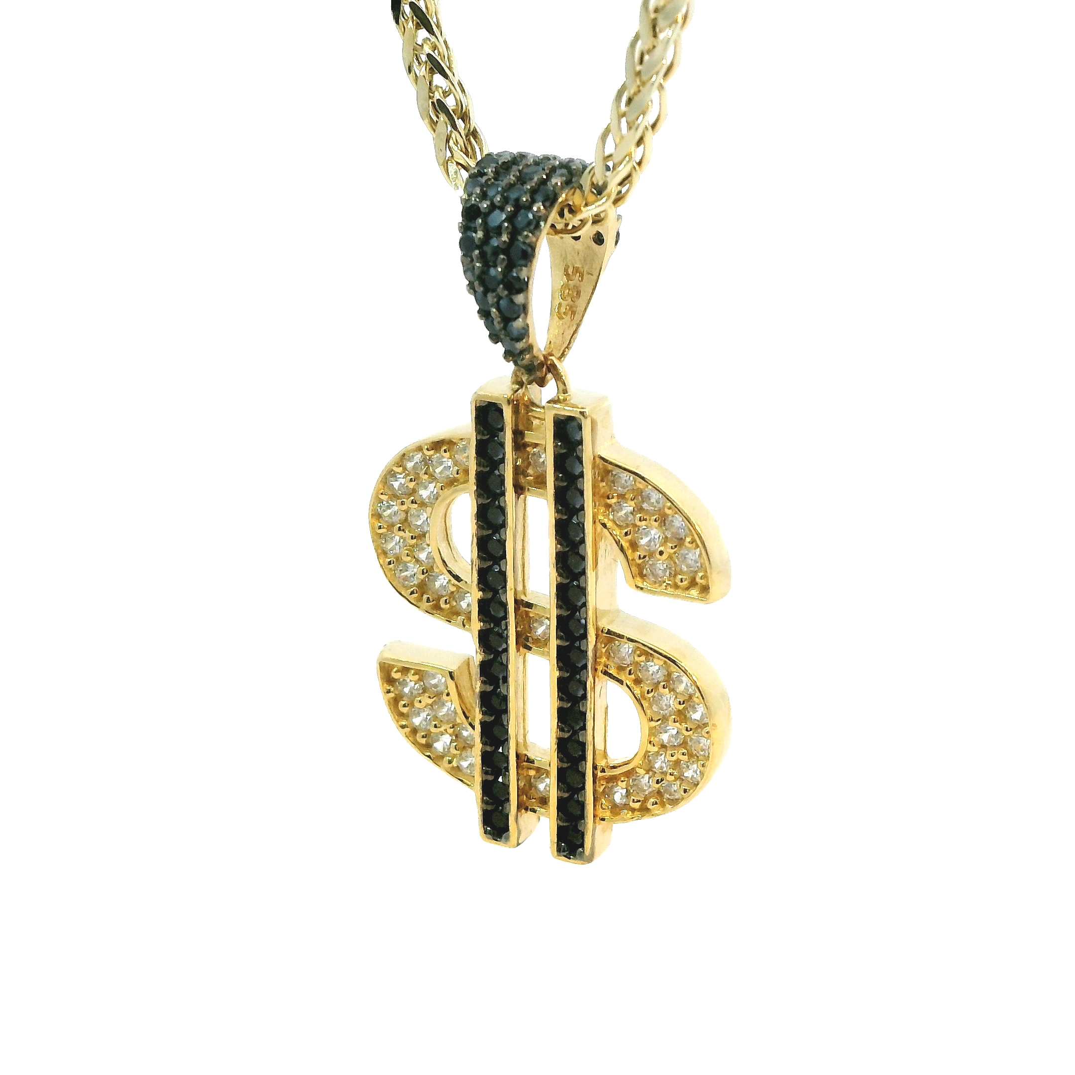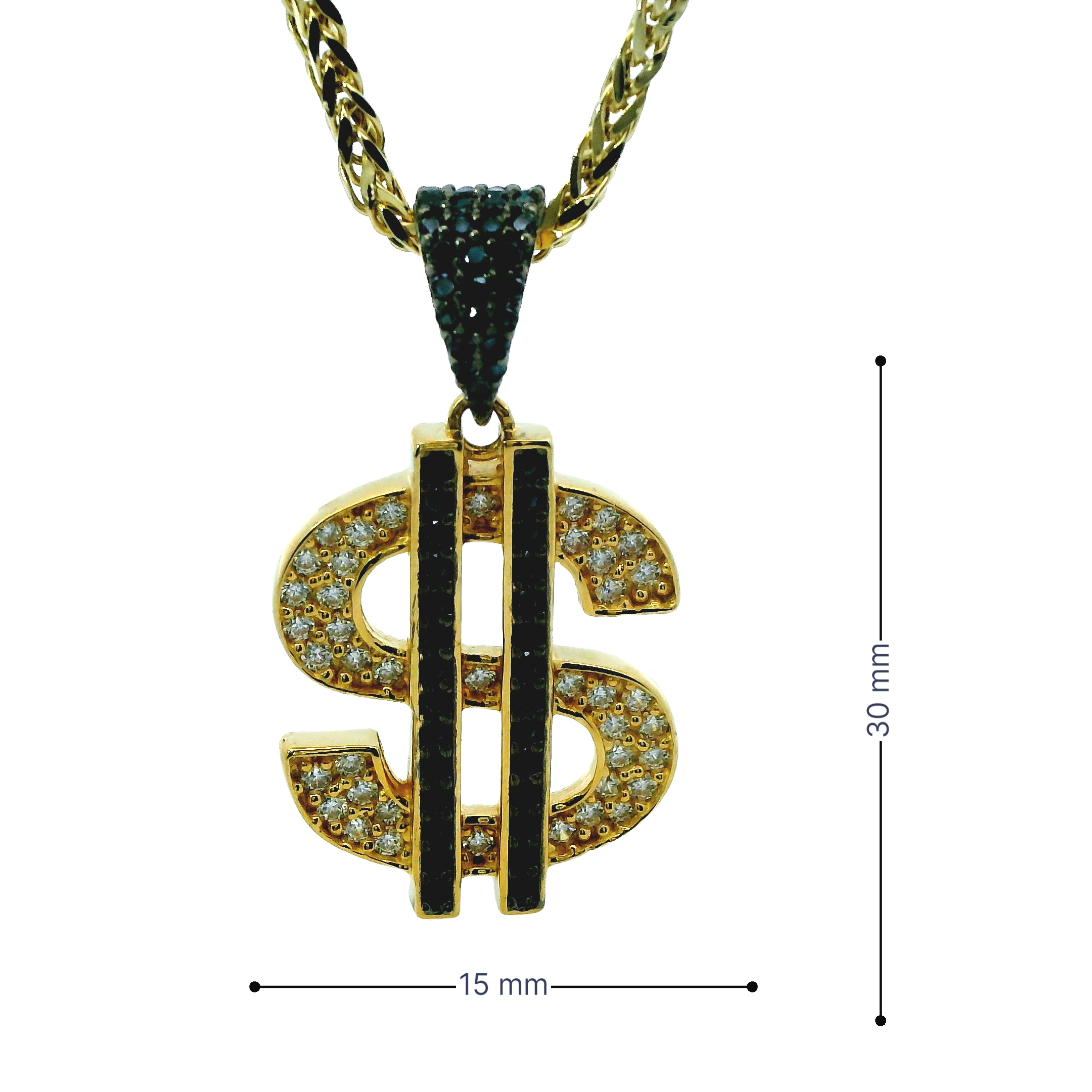 Deze hanger in de vorm van een dollarteken straalt luxe en stijl uit. Ingelegd met fonkelende zwarte zirkonia's, krijgt het klassieke symbool een moderne en krachtige uitstraling. De donkere stenen creëren een prachtig contrast met het warme geelgoud, wat dit sieraad een verfijnde en tegelijkertijd gedurfde look geeft. Een perfect accessoire voor wie succes en elegantie wil uitstralen in één opvallend ontwerp.