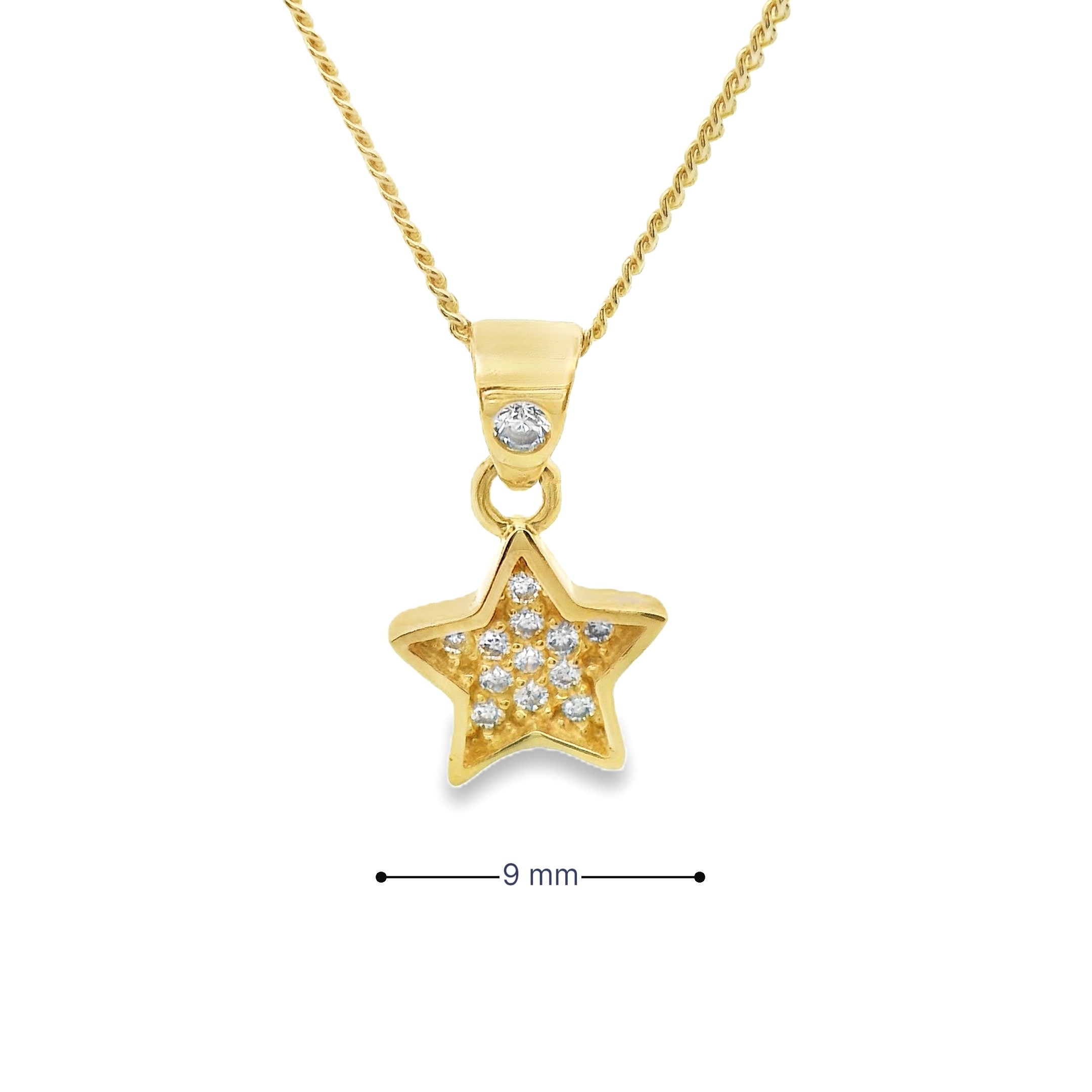 Deze hanger in de vorm van een ster, bezet met zirkonia, is een stralend en elegant sieraad. Het warme geelgoud biedt een prachtige achtergrond voor de fonkelende zirkonia steentjes, die de ster laten schitteren als een hemels juweel. Deze hanger is een tijdloos symbool van hoop, ambitie en inspiratie, perfect om elke dag een vleugje glamour toe te voegen of om te dragen bij bijzondere gelegenheden. Het is een verfijnd accessoire dat zowel eenvoud als luxe uitstraalt.