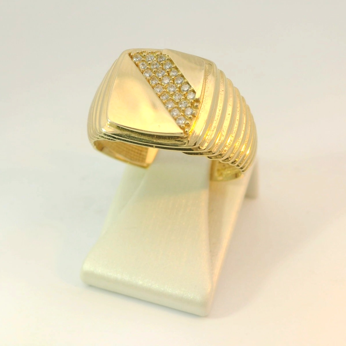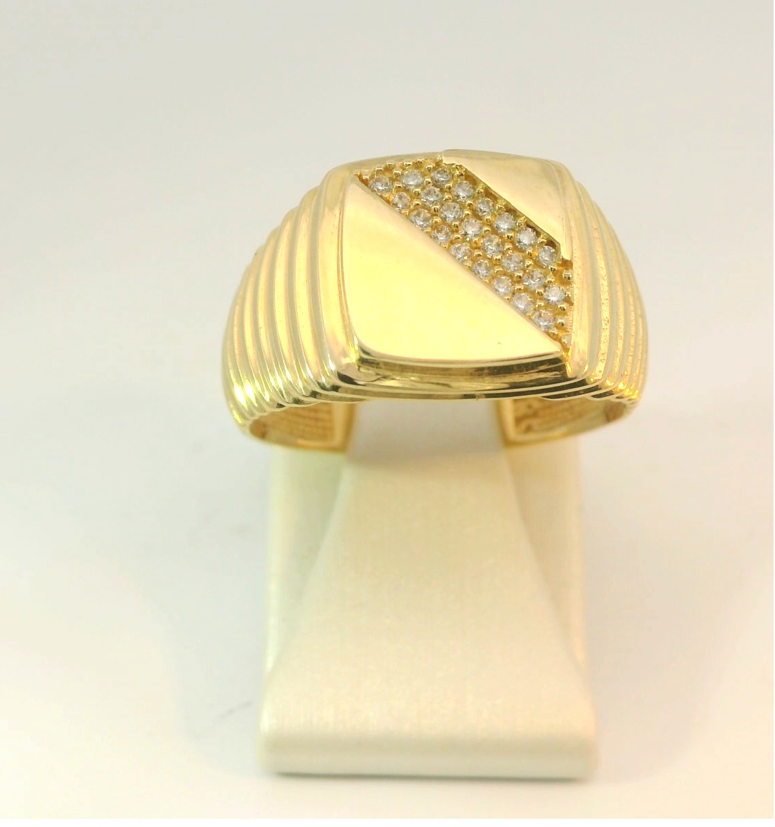 Deze prachtige herenring is gemaakt van 14 karaat geelgoud en is voorzien van schitterende zirkonia stenen. De ring heeft een stoer en stijlvol design, perfect voor mannen die houden van een luxe uitstraling. Draag deze ring solo of combineer hem met andere gouden sieraden voor een complete look. Een perfecte toevoeging aan elke herengarderobe!