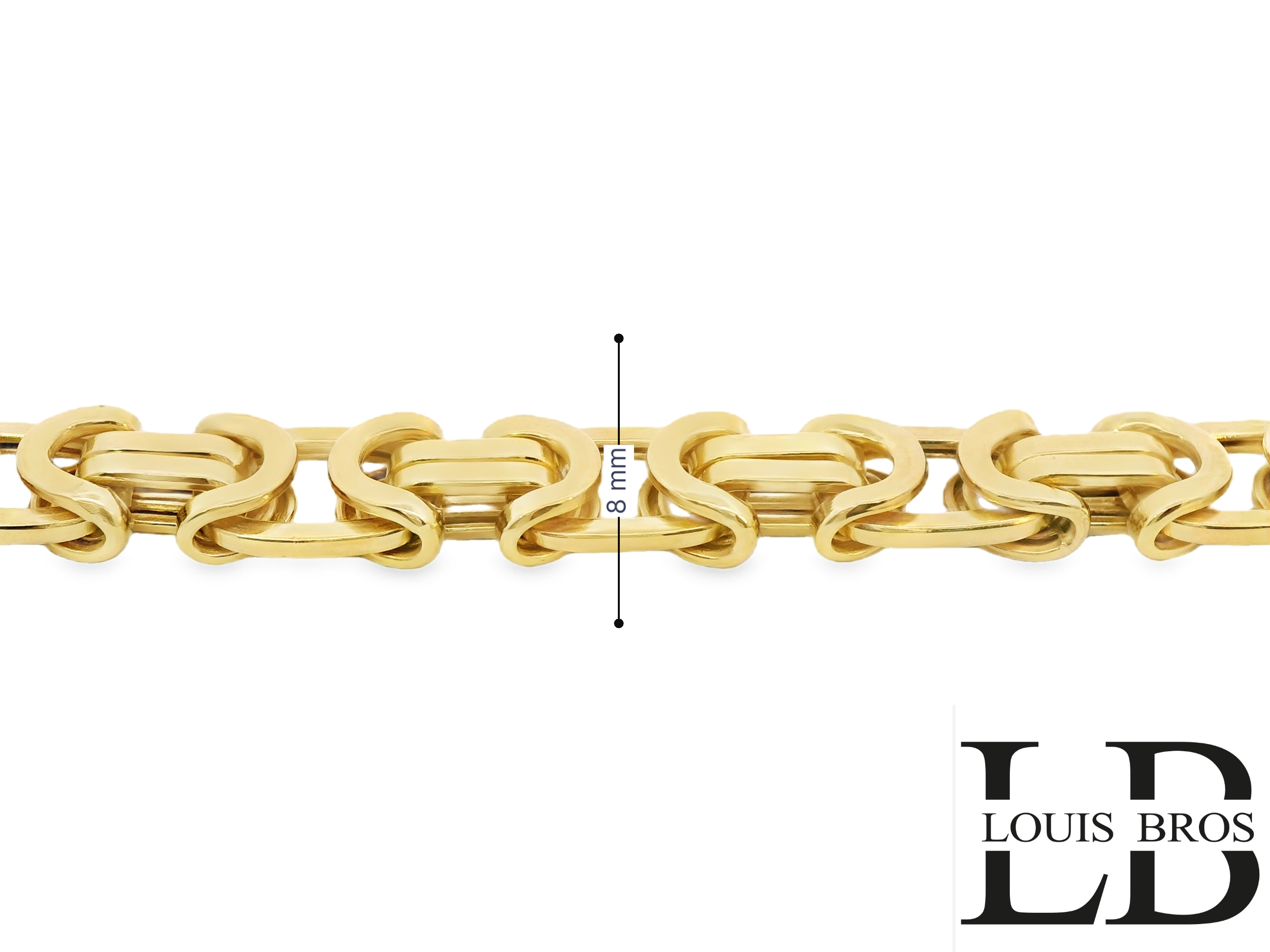 Deze koningsschakel collier van Louis Bros is vervaardigd uit 14k geelgoud (30.68 gr) .Het collier heeft een lengte van 55 cm en een breedte van 8 mm. En een dikte van 4 mm .De koningsschakel is een stoere blikvanger. Houd jij van stoer en opvallend? En draag je graag gouden sieraden? Dan is dit exemplaar echt iets voor jou!