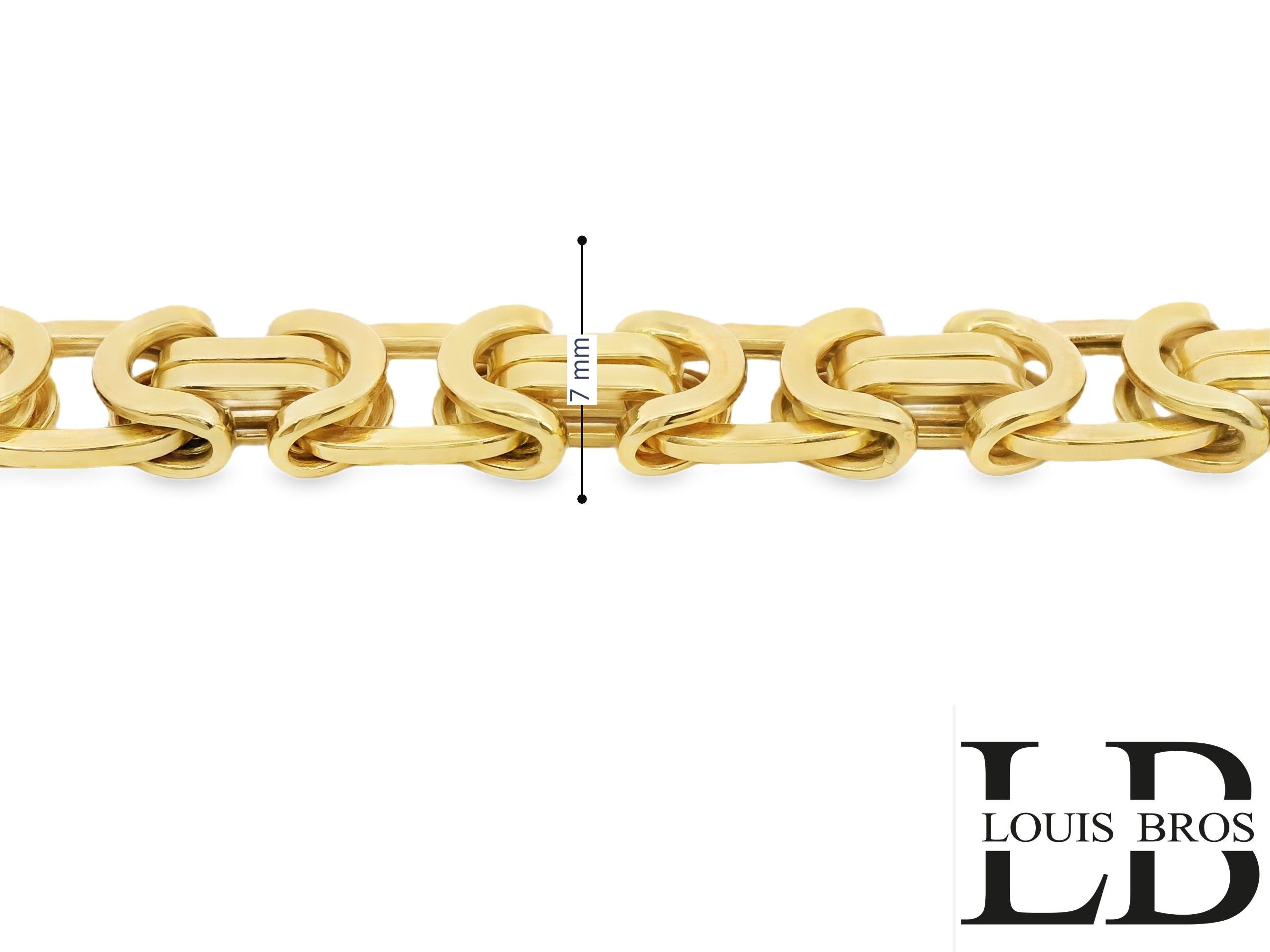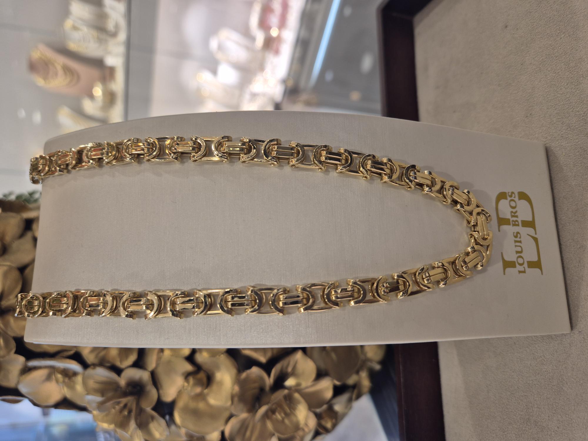 Deze koningsschakel collier van Louis Bros is vervaardigd uit 14 karaat geelgoud (89.70gr) .Het collier is massief uitgevoerd en heeft een lengte van 65 cm en een breedte van 7 mm. En een dikte van 4 mm .De koningsschakel is een stoere blikvanger. Houd jij van stoer en opvallend? En draag je graag gouden sieraden? Dan is dit exemplaar echt iets voor jou!